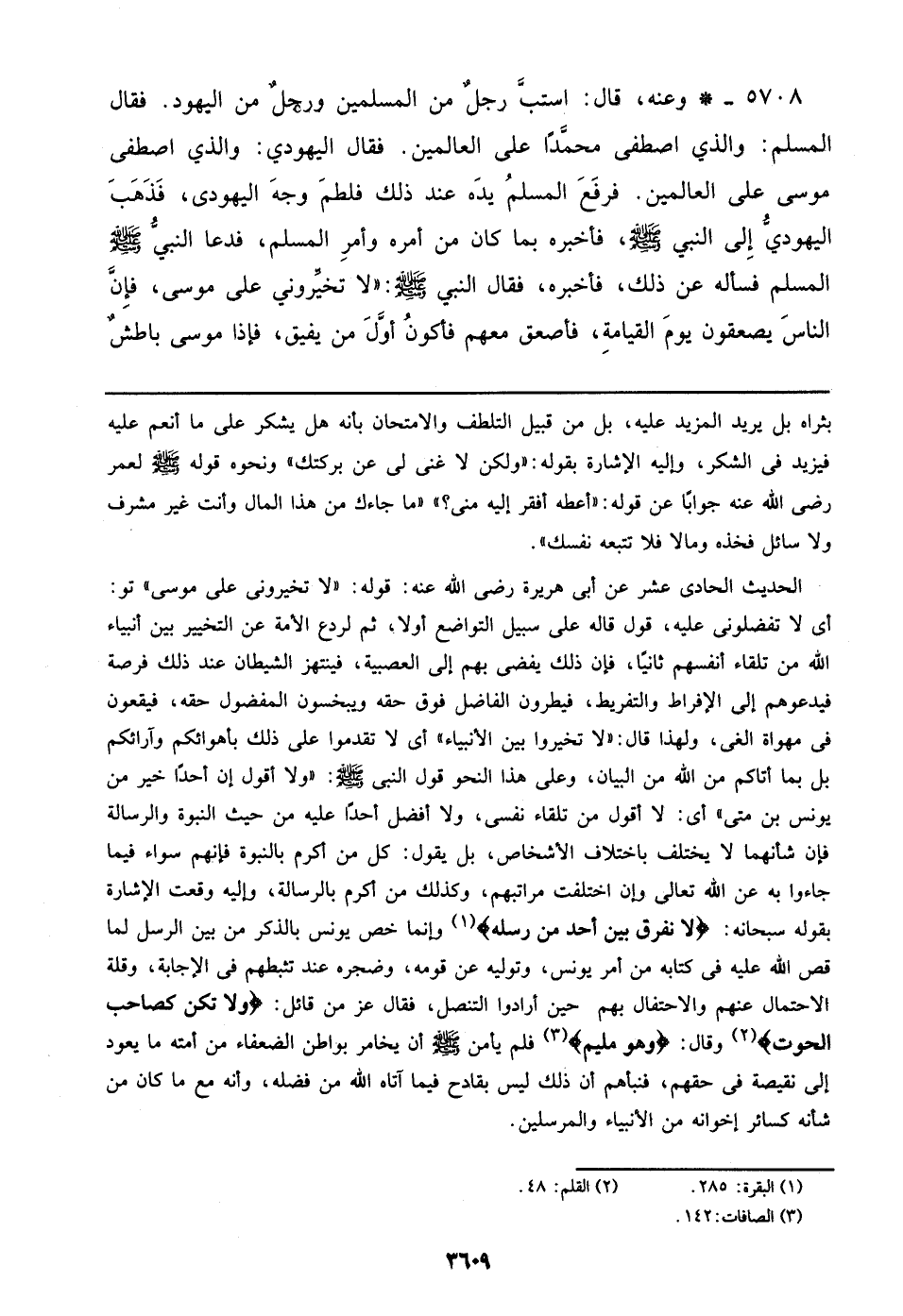 الحديث الحادي عشر عن أبي هريرة رضي الله عنه: قوله: ((لا تخيروني على موسى)) تو: أي لا تفضلوني عليه، قول قاله على سبيل التواضع أولا، ثم لردع الأمة عن التخيير بين أنبياء الله من تلقاء أنفسهم ثانيًا، فإن ذلك يفضي بهم إلى العصبية، فينتهز الشيطان عند ذلك فرصة فيدعوهم إلى الإفراط والتفريط، فيطرون الفاضل فوق حقه ويبخسون المفضول حقه، فيقعون في مهواة الغي، ولهذا قال: ((لا تخيروا بين الأنبياء)) أي لا تقدموا على ذلك بأهوائكم وآرائكم بل بما أتاكم من الله من البيان، وعلى هذا النحو قول النبي صلى الله عليه وسلم: ((ولا أقول إن أحدًا خير من يونس بن متى)) أي: لا أقول من تلقاء نفسي، ولا أفضل أحدًا عليه من حيث النبوة والرسالة فإن شأنهما لا يختلف باختلاف الأشخاص، بل يقول: كل من أكرم بالنبوة فإنهم سواء فيما جاءوا به عن الله تعالى وإن اختلفت مراتبهم، وكذلك من أكرم بالرسالة، وإليه وقعت الإشارة بقوله سبحانه: {لا نفرق بين أحد من رسله} وإنما خص يونس بالذكر من بين الرسل لما قص الله عليه في كتابه من أمر يونس، وتوليه عن قومه، وضجره عند تثبطهم في الإجابة، وقلة الاحتمال عنهم والاحتفال بهم حين أرادوا التنصل، فقال عز من قائل: {ولا تكن كصاحب الحوت} وقال: {وهو مليم} فلم يأمن صلى الله عليه وسلم أن يخامر بواطن الضعفاء من أمته ما يعود إلى نقيصة في حقهم، فنبأهم أن ذلك ليس بقادح فيما آتاه الله من فضله، وأنه مع ما كان من شأنه كسائر إخوانه من الأنبياء والمرسلين.