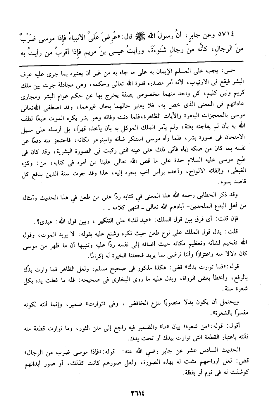 حس: يجب على المسلم الإيمان به على ما جاء به من غير أن يعتبره بما جرى عليه عرف البشر فيقع في الارتياب، لأنه أمر مصدره قدرة الله تعالى وحكمه، وهي مجادلة جرت بين ملك كريم ونبي كليم، كل واحد منهما مخصوص بصفة يخرج بها عن حكم عوام البشر ومجاري عاداتهم في المعنى الذي خص به، فلا يعتبر حالهما بحال غيرهما، وقد اصطفي الله تعالى موسى بالمعجزات الباهرة والآيات الظاهرة، فلما دنت وفاته وهو بشر يكره الموت طبعًا لطف الله به بأن لم يفاجئه بغتة، ولم يأمر الملك الموكل به بأن يأخذه قهرًا، بل أرسله على سبيل الامتحان في صورة بشر، فلما رآه موسى استنكر شأنه واستوعر مكانه، فاحتجز منه دفعًا عن نفسه بما كان من صكه إياه فأتى ذلك على عينه التي ركبت في الصورة البشرية، وقد كان في طبع موسى عليه السلام حدة على ما قص الله تعالى علينا من أمره في كتابه، من: وكزه القبطي، وإلقائه الألواح، وأخذه برأس أخيه يجره إليه، هذا وقد جرت سنة الدين بدفع كل قاصد بسوء.