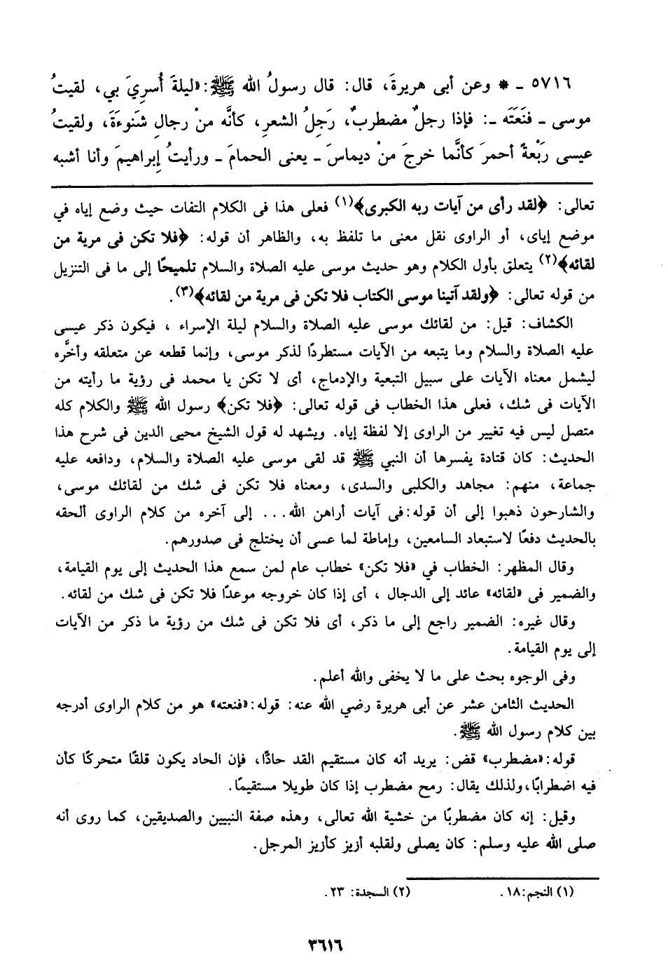 الكشاف: قيل: من لقائك موسى عليه الصلاة والسلام ليلة الإسراء، فيكون ذكر عيسى عليه الصلاة والسلام وما يتبعه من الآيات مستطردًا لذكر موسى، وإنما قطعة عن متعلقه وأخره ليشمل معناه الآيات على سبيل التبعية والإدماج، أي لا تكن يا محمد في رؤية ما رأيته من الآيات في شك، فعلى هذا الخطاب في قوله تعالى: {فلا تكن} رسول الله صلى الله عليه وسلم والكلام كله متصل ليس فيه تغيير من الراوى إلا لفظة إياه. ويشهد له قول الشيخ محيى الدين في شرح هذا الحديث: كان قتادة يفسرها أن النبي صلى الله عليه وسلم قد لقى موسى عليه الصلاة والسلام، ودافعه عليه جماعة، منهم: مجاهد والكلبى والسدى، ومعناه فلا تكن في شك من لقائك موسى، والشارحون ذهبوا إلى أن قوله: في آيات أراهن الله ... إلى آخره من كلام الراوى ألحقه بالحديث دفعًا لاستبعاد السامعين، وإماطة لما عسى أن يختلج في صدورهم.