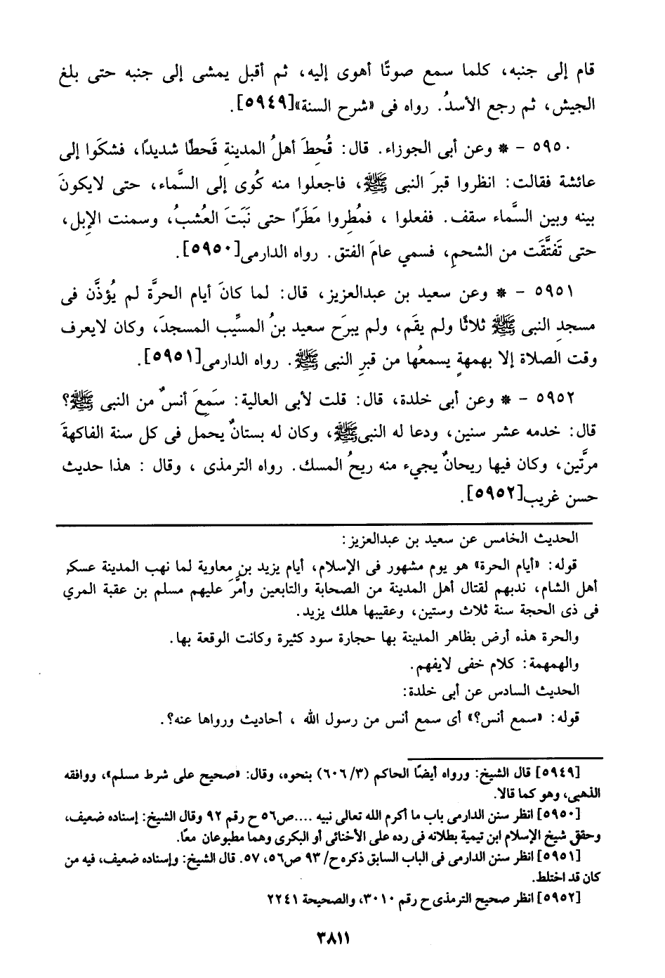 5951 - وعن سعيد بن عبد العزيز، قال: لما كان أيام الحرة لم يؤذن في مسجد النبي صلى الله عليه وسلم ثلاثاً ولم يقم، ولم يبرح سعيد بن المسيب المسجد، وكان لا يعرف وقت الصلاة إلا بهمهة يسمعها من قبر النبي صلى الله عليه وسلم. رواه الدارمي [5951].