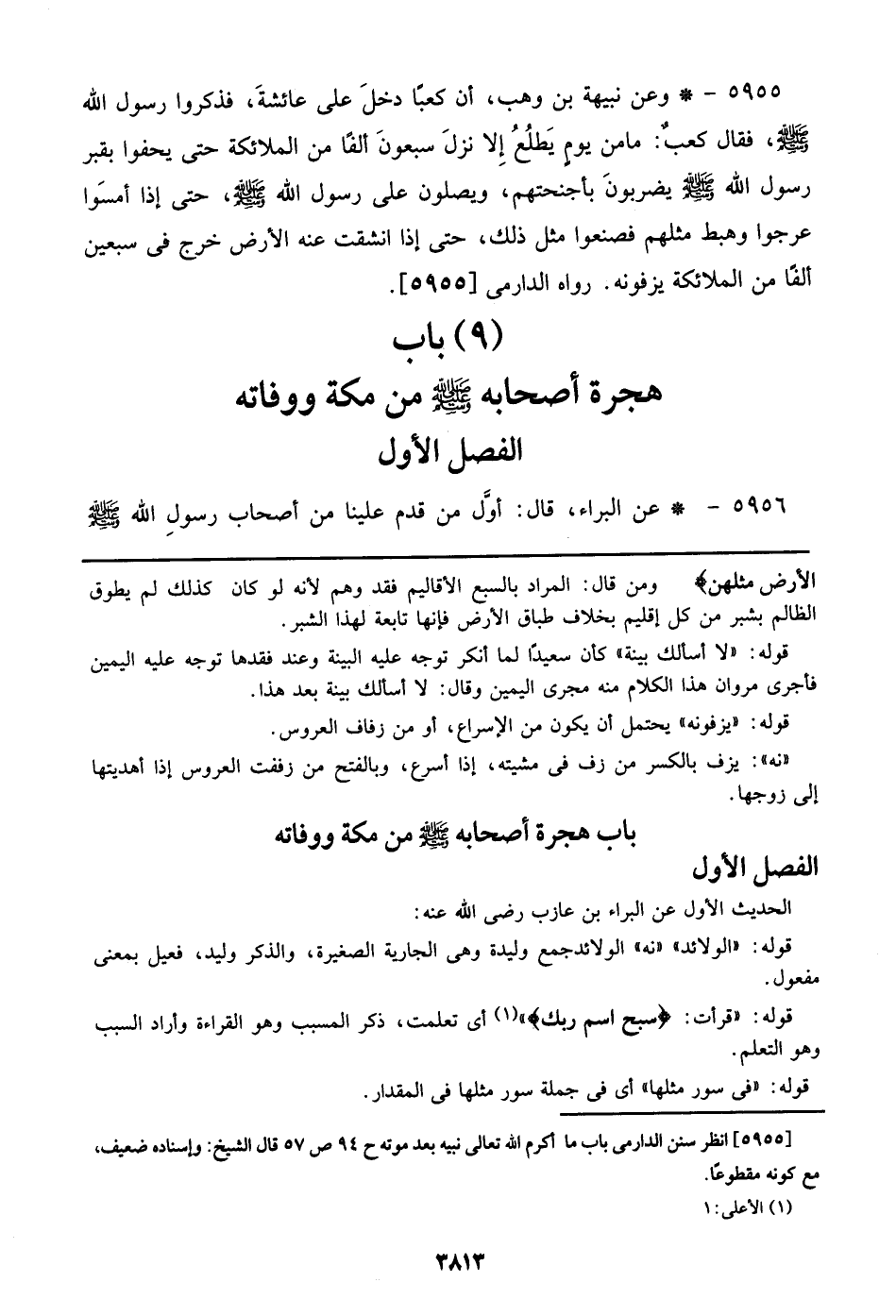 5955 - وعن نبيهة بن وهب، أن كعباً دخل على عائشة، فذكروا رسول الله صلى الله عليه وسلم، فقال كعب: ما من يوم يطلع إلا نزل سبعون ألفاً من الملائكة حتى يحفوا بقبر رسول الله صلى الله عليه وسلم يضربون بأجنحتهم، ويصلون على رسول الله صلى الله عليه وسلم، حتى إذا أمسوا عرجوا وهبطوا مثلهم فصنعوا مثل ذلك، حتى إذا انشقت عنه الأرض خرج في سبعين ألفاً من الملائكة يزفونه. رواه الدارمي [5955].