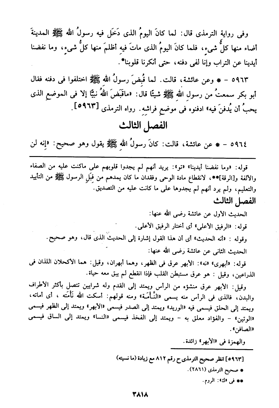 5963 - وعن عائشة، قالت. لما قبض رسول الله صلى الله عليه وسلم اختلفوا في دفنه فقال أبو بكر سمعت من رسول الله صلى الله عليه وسلم شيئاً قال: ((ما قبض الله نبياً إلا في الموضع الذي يحب أن يدفن فيه)) ادفنوه في موضع فراشه. رواه الترمذي [5963].