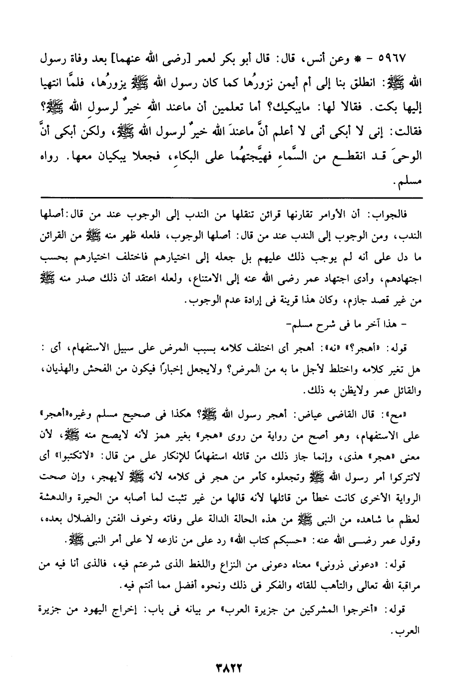((مح)): قال القاضي عياض: أهجر رسول الله صلى الله عليه وسلم؟ هكذا في صحيح مسلم وغيره ((أهجر)) على الاستفهام، وهو أصح من رواية من روى ((هجر)) بغير همز لأنه لا يصح منه صلى الله عليه وسلم، لأن معنى ((هجر)) هذى، وإنما جاز ذلك من قائله استفهاماً للإنكار على من قال: ((لا تكتبوا)) أي لا تتركوا أمر رسول الله صلى الله عليه وسلم وتجعلوه كأمر من هجر في كلامه لأنه صلى الله عليه وسلم لا يهجر، وإن صحت الرواية الأخرى كانت خطأ من قائلها لأنه قالها من غير تثبت لما أصابه من الحيرة والدهشة لعظم ما شاهده من النبي صلى الله عليه وسلم من هذه الحالة الدالة على وفاته وخوف الفتن والضلال بعده، وقول عمر رضي الله عنه: ((حسبكم كتاب الله)) رد على نازعه لا على أمر النبي صلى الله عليه وسلم.