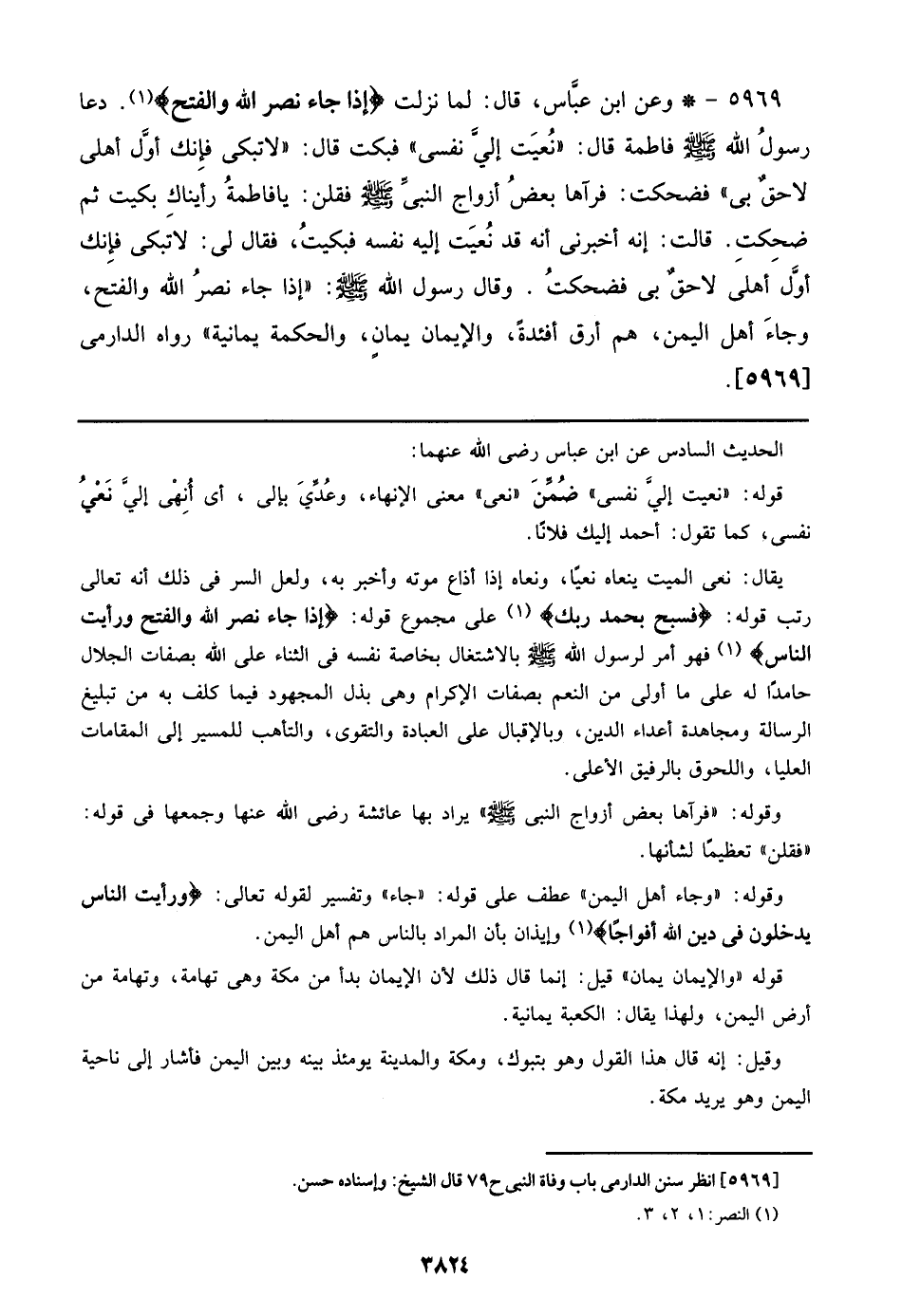 5969 - وعن ابن عباس، قال: لما نزلت {إذا جاء نصر الله والفتح}. دعا رسول الله صلى الله عليه وسلم فاطمة قال: ((نعيت إلي نفسي) فبكت قال: ((لا تبكي فإنك أول أهلي لاحق بي)) فضحكت: فرآها بعض أزواج النبي صلى الله عليه وسلم فقلن: يا فاطمة رأيناك بكيت ثم ضحكت. قالت: إنه أخبرني أنه قد نعيت إليه نفسه فبكيت، فقال لي: لا تبكي فإنك أول أهلي لاحق بي فضحكت. وقال رسول الله صلى الله عليه وسلم: ((إذا جاء نصر الله والفتح، وجاء أهل اليمين، هم أرق أفئدة، والإيمان يمان، والحكمة يمانية)) رواه الدارمي [5969].