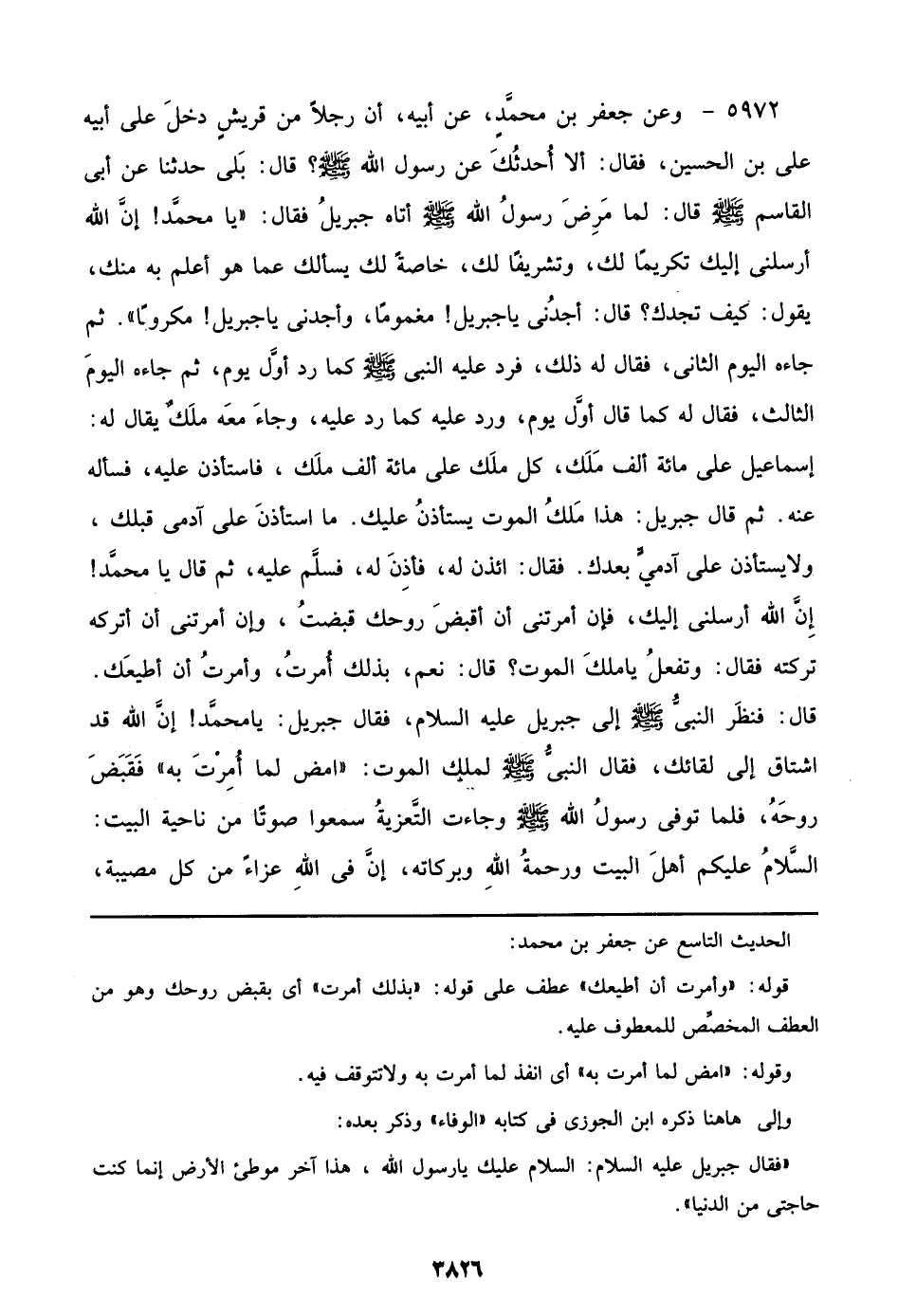 5972 - وعن جعفر بن محمد، عن أبيه، أن رجلاً من قريش دخل على أبيه على بن الحسين، فقال: ألا أحدثك عن رسول الله صلى الله عليه وسلم؟ قال: بلى حدثنا عن أبي القاسم صلى الله عليه وسلم قال لما مرض رسول الله صلى الله عليه وسلم أتاه جبريل فقال: ((يا محمد! إن الله أرسلني إليك تكريماً لك، وتشريفاً لك، خاصة لك يسألك عما هو أعلم به منك، يقول: كيف تجدك؟ قال: أجدني يا جبريل! مغموماً، وأجدني يا جبريل! مكروباً)). ثم جاءه اليوم الثاني، فقال له ذلك، فرد عليه النبي صلى الله عليه وسلم كما رد أول يوم، ثم جاءه اليوم الثالث، فقال له كما قال أول يوم، ورد عليه كما رد عليه، وجاء معه ملك يقال له: إسماعيل على مائة ألف ملك، كل ملك على مائة ألف ملك، فاستأذن عليه، فسأله عنه. ثم قال جبريل: هذا ملك الموت يستأذن عليك. ما استأذن على آدمي قبلك، ولا يستأذن على آدمي بعدك. فقال: ائذن له، فأذن له، فسلم عليه، ثم قال يا محمد! إن الله أرسلني إليك، فإن أمرتني أن أقبض روحك قبضت، وإن أمرتني أن أتركه تركته فقال: وتفعل يا ملك الموت؟ قال: نعم، بذلك أمرت، وأمرت أن أطيعك. قال: فنظر النبي صلى الله عليه وسلم إلى جبريل عليه السلام، فقال جبريل: يا محمد! إن الله قد اشتاق إلى لقائك، فقال النبي صلى الله عليه وسلم لملك الموت: ((امض لما أمرت به)) فقبض روحه، فلما توفي رسول الله صلى الله عليه وسلم وجاءت التعزية سمعوا صوتاً من ناحية البيت: السلام عليكم أهل البيت ورحمة الله وبركاته، إن في الله عزاء من كل مصيبة،