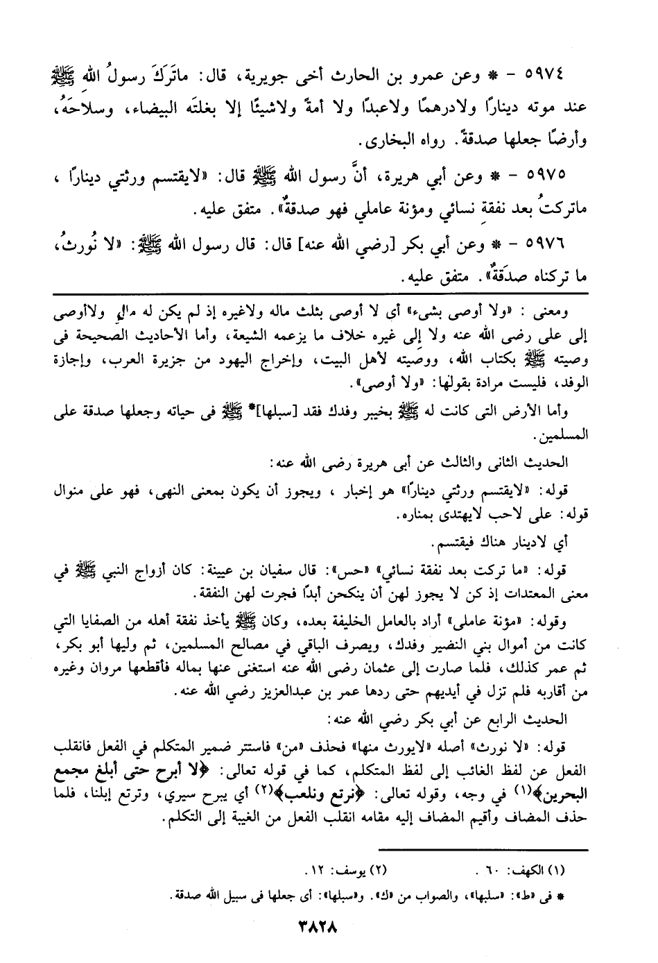 5975 - وعن أبي هريرة، أن رسول الله صلى الله عليه وسلم قال: ((لا يقتسم ورثتي ديناراً، ما تركت بعد نفقة نسائي ومؤنة عاملي فهو صدقة)). متفق عليه.