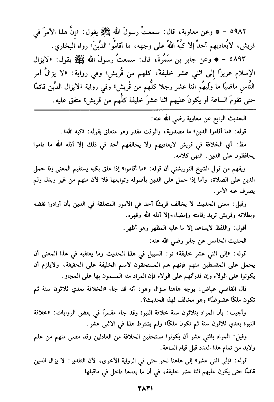 5893 - وعن جابر بن سمرة، قال: سمعت رسول الله صلى الله عليه وسلم يقول: ((لا يزال الإسلام عزيزاً إلى اثني عشر خليفة، كلهم من قريش)) وفي رواية: ((لا يزال أمر الناس ماضياً ما وليهم اثنا عشر رجلاً كلهم من قريش)) وفي رواية ((لا يزال الدين قائماً حتى تقوم الساعة أو يكون عليهم اثنا عشر خليفة كلهم من قريش)) متفق عليه.