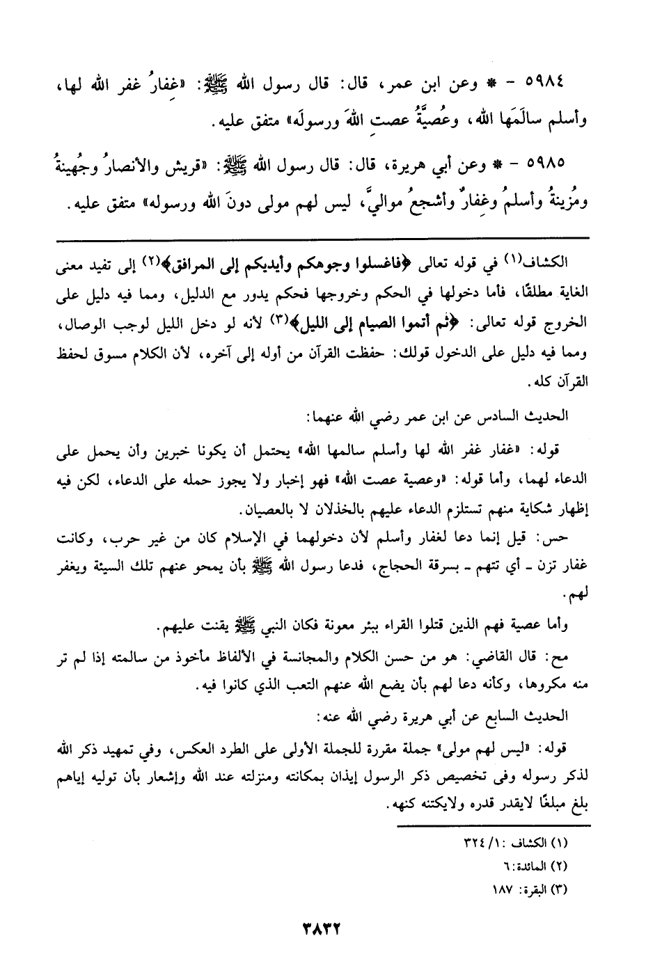 الكشاف في قوله تعالى {فاغسلوا وجوهكم وأيديكم إلى المرافق} إلى تفيد معنى الغاية مطلقاً، فأما دخولها في الحكم وخروجها فحكم يدور مع الدليل، ومما فيه دليل على الخروج قوله تعالى: {ثم أتموا الصيام إلى الليل} لأنه لو دخل الليل لوجب الوصال، ومما فيه دليل على الدخول قولك: حفظت القرآن من أوله إلى آخره، لأن الكلام مسوق لحفظ القرآن كله.