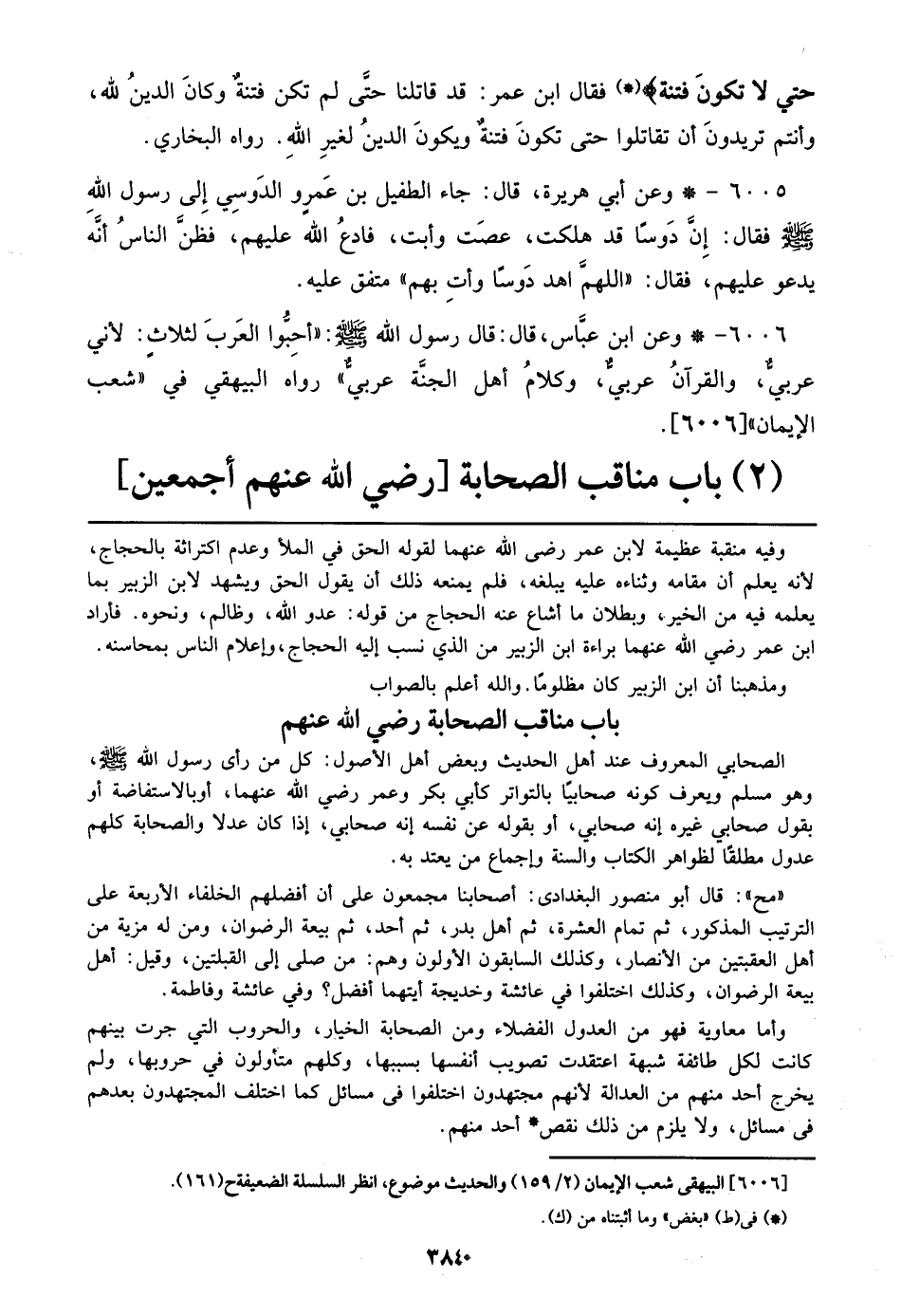 6006 - وعن ابن عباس، قال: قال رسول الله صلى الله عليه وسلم: ((أحبوا العرب لثلاث: لأني عربي، والقرآن عربي، وكلام أهل الجنة عربي)) رواه البيهقي في ((شعب الإيمان)) [6006].