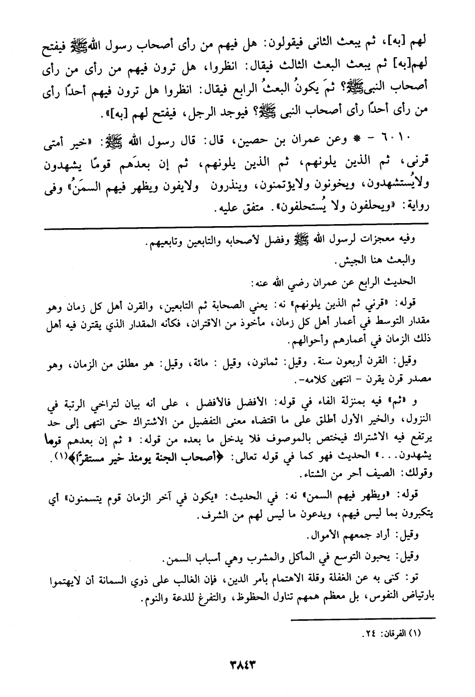 6010 - وعن عمران بن حصين، قال: قال رسول الله صلى الله عليه وسلم: ((خير أمتي قرني، ثم الذين يلونهم، ثم الذين يلونهم، ثم إن بعدهم قوماً يشهدون ولا يستشهدون، ويخونون ولا يؤتمنون، وينذرون ولا يفون ويظهر فيهم السمن)) وفي رواية: ((ويحلفون ولا يستحلفون)). متفق عليه.