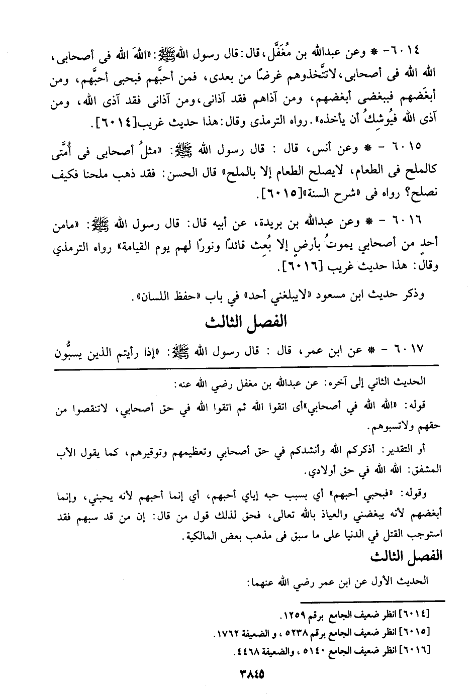 6014 - وعن عبد الله بن مغفل، قال: قال رسول الله صلى الله عليه وسلم: ((الله الله في أصحابي، الله الله في أصحابي، لا تتخذونهم غرضاً من بعدي، فمن أحبهم فبحبي أحبهم، ومن أبغضهم فببغضي أبغضهم، ومن آذاهم فقد آذاني، ومن آذاني فقد آذى الله، ومن آذى الله فيوشك أن يأخذه)). رواه الترمذي وقال: هذا حديث غريب [6014]