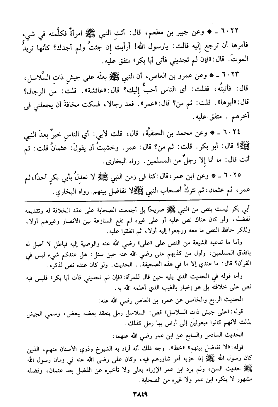 6023 - وعن عمرو بن العاص، أن النبي صلى الله عليه وسلم بعثه على جيش ذات السلاسل، قال: فأتيته، فقلت: أي الناس أحب إليك؟ قال: ((عائشة)). قلت: من الرجال؟ قال: ((أبوها)). قلت: ثم من؟ قال: ((عمر)). فعد رجالا، فسكت مخافة أن يجعلني في آخرهم. متفق عليه.
