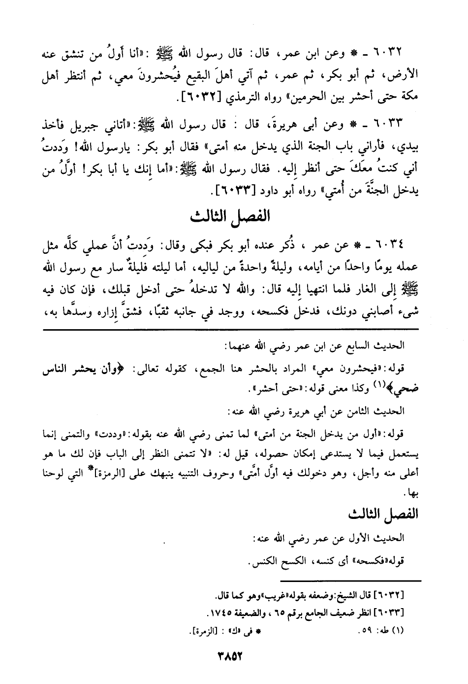 6032 - وعن ابن عمر، قال: قال رسول الله صلى الله عليه وسلم: ((أنا أول من تنشق عنه الأرض، ثم أبو بكر، ثم عمر، ثم آتى أهل البقيع فيحشرون معي، ثم أنتظر أهل مكة حتى أحشر بين الحرمين)) رواه الترمذي [6034].