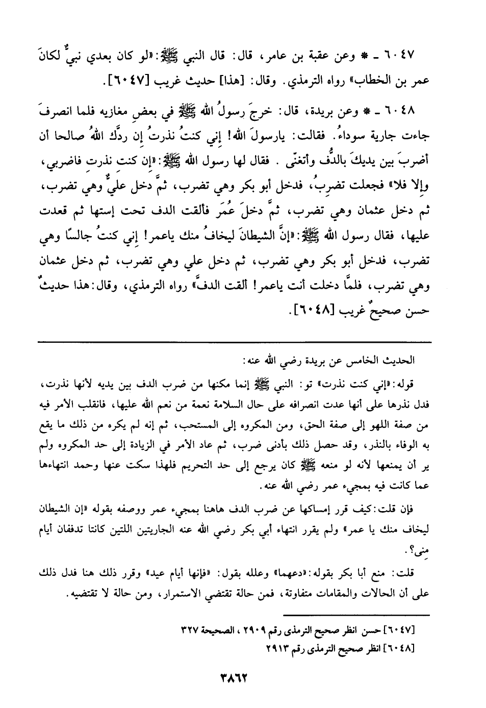 6048 - وعن بريدة، قال: خرج رسول الله صلى الله عليه وسلم في بعض مغازيه فلما انصرف جاءت جارية سوداء. فقالت: يا رسول الله! إني كنت نذرت إن ردك الله صالحاً أن أضرب بين يديك بالدف وأتغنى. فقال لها رسول الله صلى الله عليه وسلم: ((إن كنت نذرت فاضربني، وإلا فلا)) فجعلت تضرب، فدخل أبو بكر وهي تضرب، ثم دخل علي وهي تضرب، ثم دخل عثمان وهي تضرب، ثم دخل عمر فألقت الدف تحت إستها ثم قعدت عليها، فقال رسول الله صلى الله عليه وسلم: ((إن الشيطان ليخاف منك يا عمر! إني كنت جالساً وهي تضرب، فدخل أبو بكر وهي تضرب، ثم دخل علي وهي تضرب، ثم دخل عثمان وهي تضرب، فلما دخلت أنت يا عمر! ألقت الدف)) رواه الترمذي، وقال: هذا حديث حسن صحيح غريب [6048].