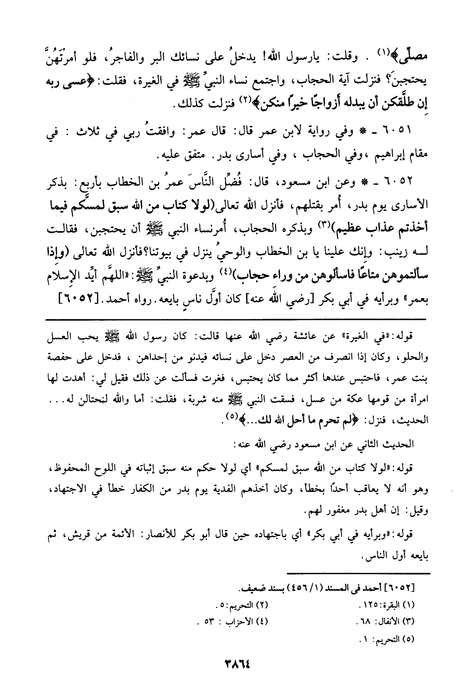6051 - وفي رواية لابن عمر قال: قال عمر: وافقت ربي في ثلاث: في مقام إبراهيم، وفي مقام إبراهيم، وفي الحجاب، وفي أسارى بدر. متفق عليه.