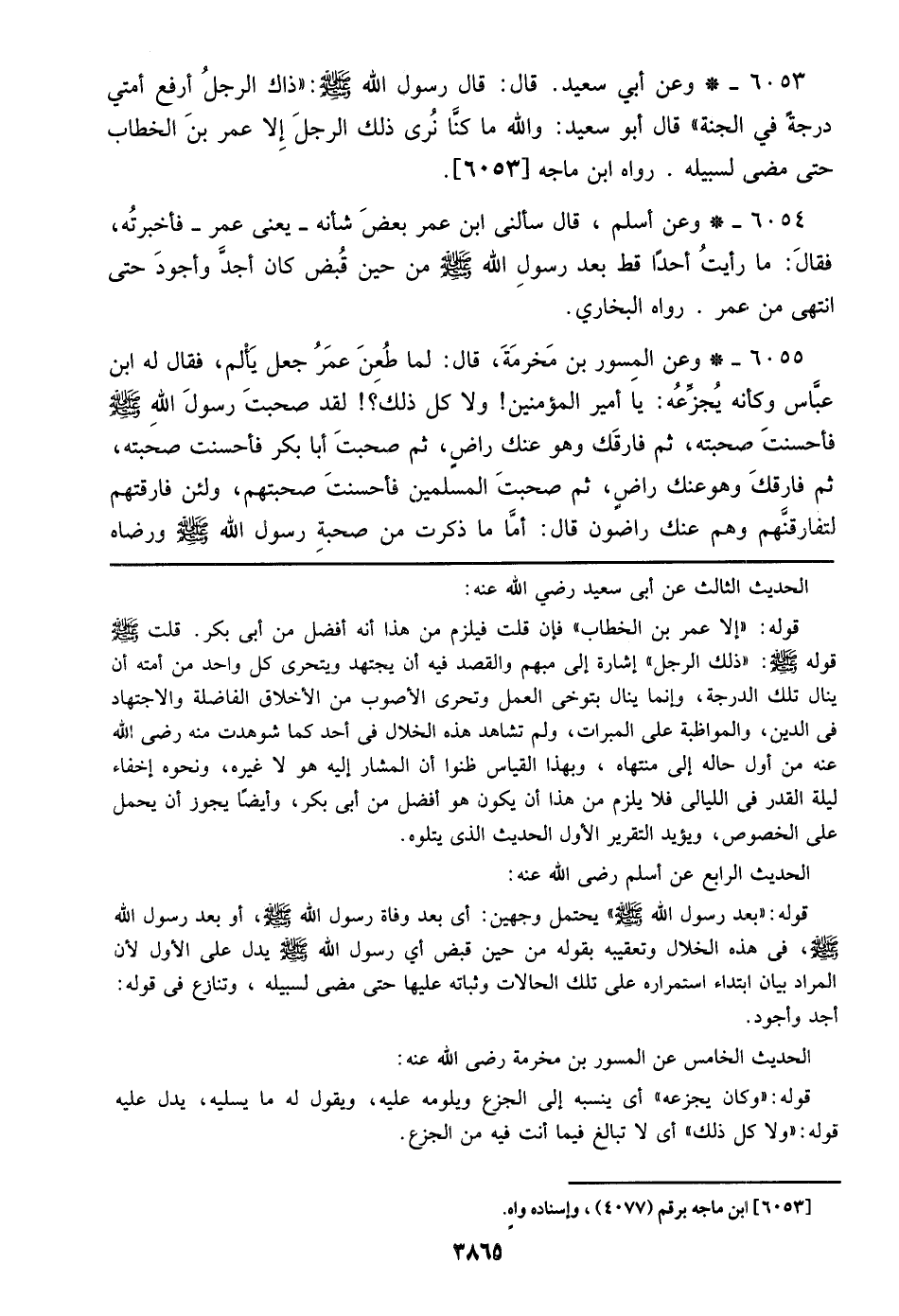 6053 - وعن أبي سعيد. قال: قال رسول الله صلى الله عليه وسلم: ((ذاك الرجل أرفع أمتي درجة في الجنة)) قال أبو سعيد: والله ما كنا نرى ذلك الرجل إلا عمر بن الخطاب حتى مضى لسبيله. رواه ابن ماجه [6053].