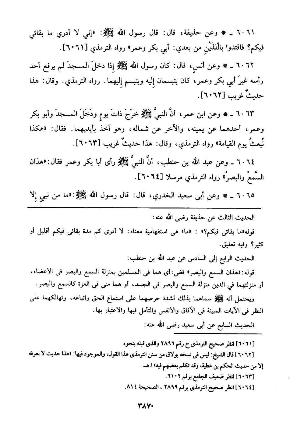 6061 - وعن حذيفة، قال: قال رسول الله صلى الله عليه وسلم: ((إني لا أدري ما بقائي فيكم؟ فاقتدوا باللذين من بعدي: أبي بكر وعمر)) رواه الترمذي [6061]