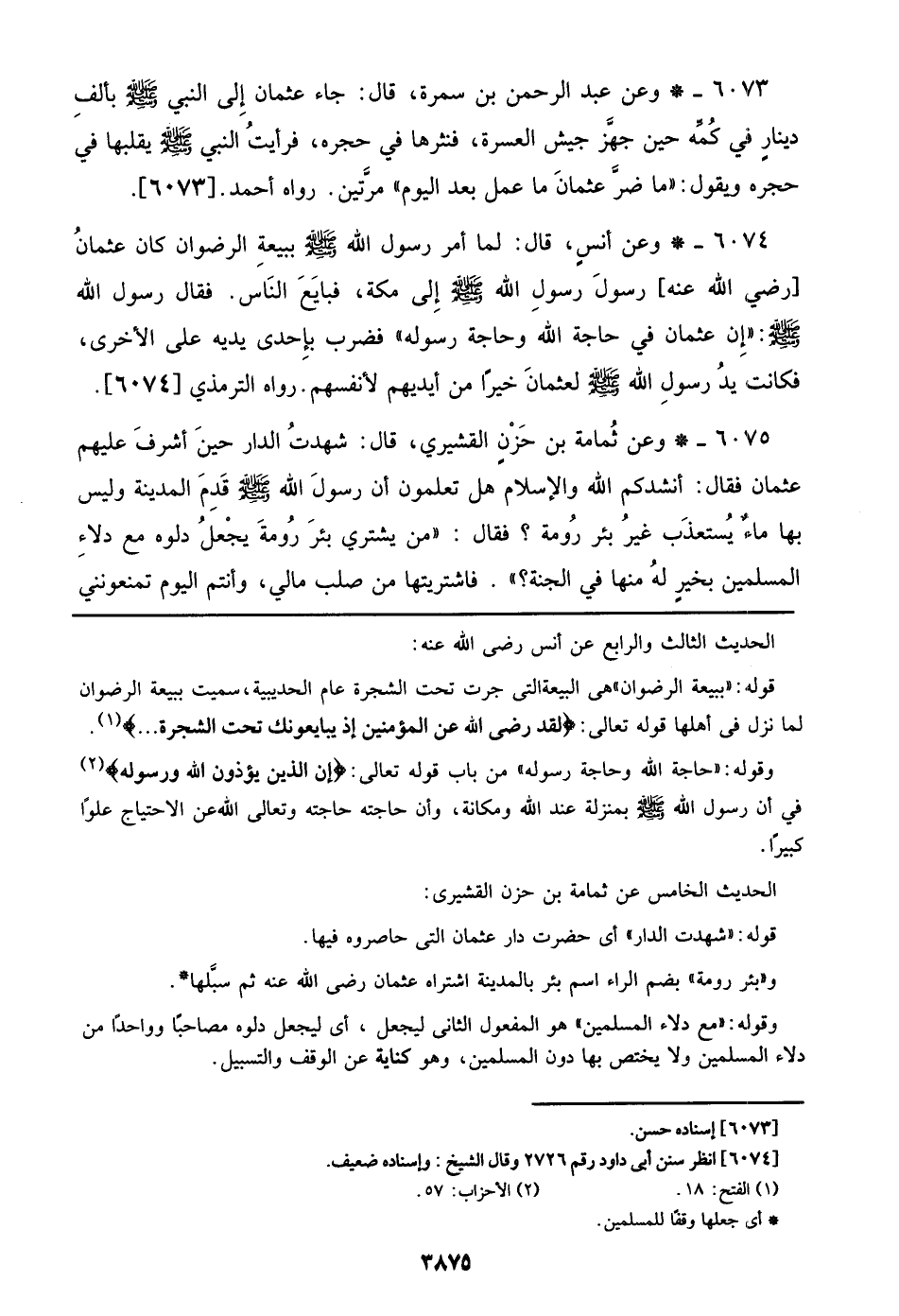 6075 - وعن ثمامة بن حزن القشيري، قال: شهدت الدار حين أشرف عليهم عثمان فقال: أنشدكم الله والإسلام هل تعلمون أن رسول الله صلى الله عليه وسلم قدم المدينة وليس بها ماء يستعذب غير بئر رومة؟ فقال: ((من يشتري بئر رومة يجعل دلوه مع دلاء المسلمين بخير له منها في الجنة؟)). فاشتريتها من صلب مالي، وأنتم اليوم تمنعونني