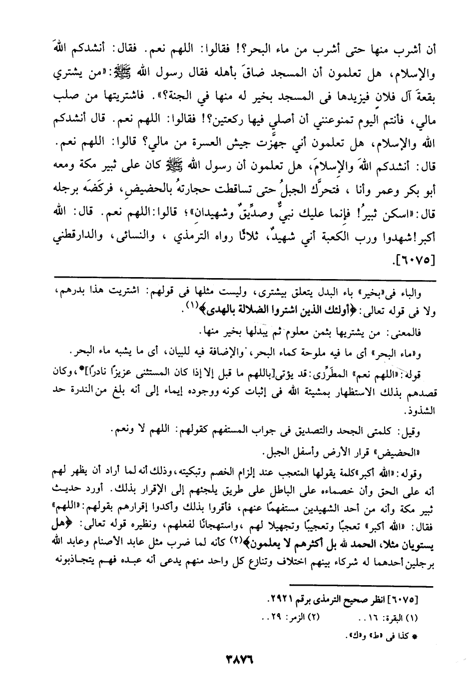 أن أشرب منها حتى أشرب من ماء البحر؟! فقالوا: اللهم نعم. فقال: أنشدكم الله والإسلام، هل تعلمون أن المسجد ضاق بأهله فقال رسول الله صلى الله عليه وسلم: ((من يشتري بقعة آل فلان فيزيدها في المسجد بخير له منها في الجنة؟)). فاشتريتها من صلب مالي، فأنتم اليوم تمنوعنني أن أصلي فيها ركعتين؟! فقالوا: اللهم نعم. قال أنشدكم الله والإسلام، هل تعلمون أني جهزت جيش العسرة من مالي؟ قالوا: اللهم نعم. قال: أنشدكم الله والإسلام، هل تعلمون أن رسول الله صلى الله عليه وسلم كان على ثبير مكة ومعه أبو بكر وعمر وأنا، فتحرك الجبل حتى تساقطت حجارته بالحضيض، فركضه برجله قال: ((اسكن ثبير! فإنما عليك نبي وصديق وشهيدان))؛ قالوا: اللهم نعم. قال: الله أكبر! شهدوا ورب الكعبة أني شهيد، ثلاثا رواه الترمذي، والنسائي، والدارقطني [6075].