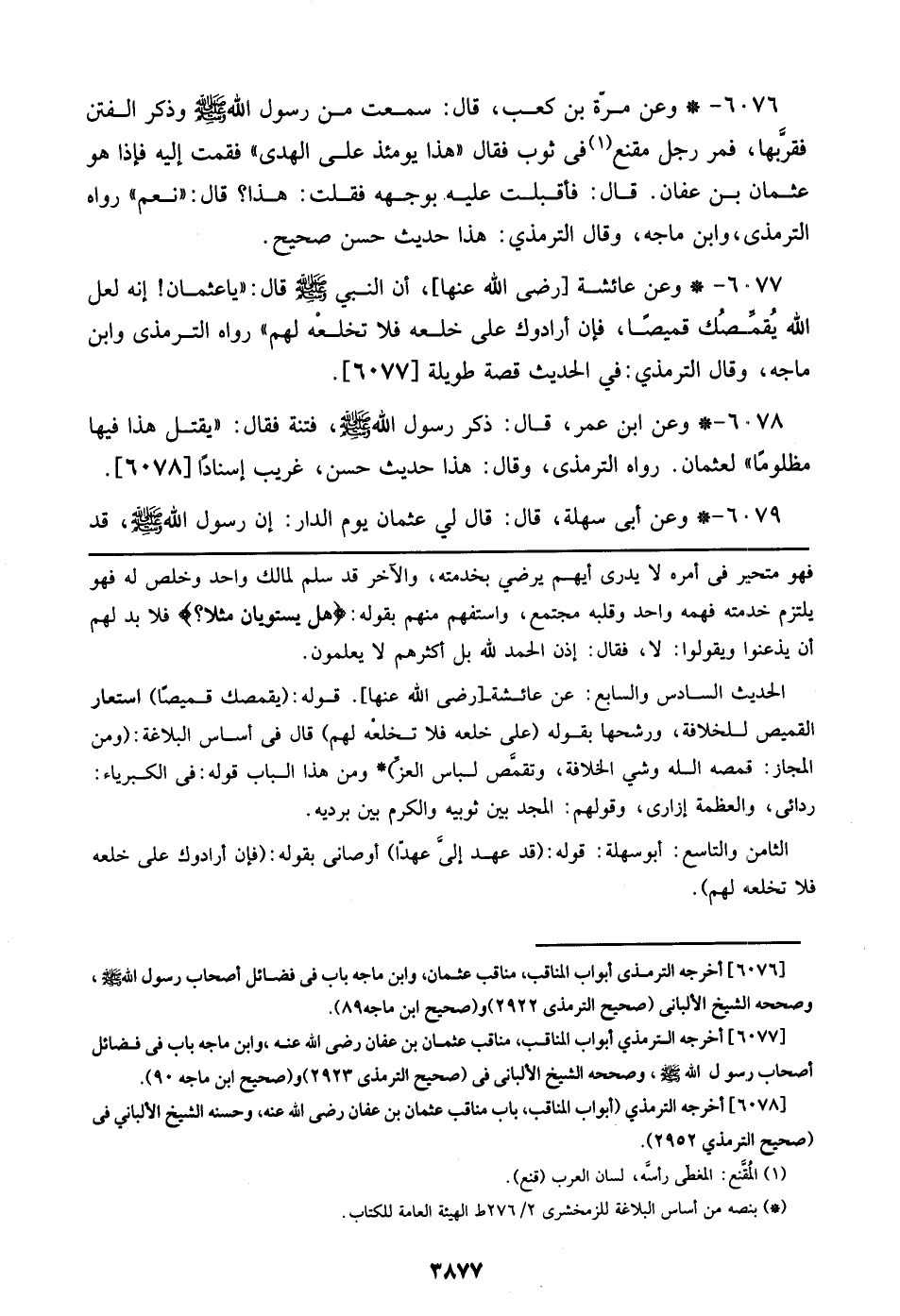6077 - وعن عائشة [رضي الله عنه]، أن النبي صلى الله عليه وسلم قال: ((يا عثمان! إنه لعل الله يقمصك قميصاً، فإن أرادوك على خلعه فلا تخلعه لهم)) رواه الترمذي وابن ماجه، وقال الترمذي: في الحديث قصة طويلة [6077]