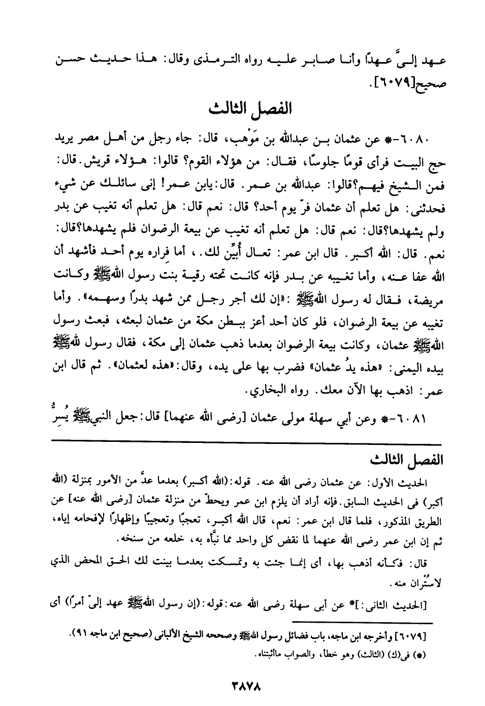الحديث الأول: عن عثمان رضي الله عنه: قوله: (الله أكبر) بعدما عد من الأمور بمنزلة (الله أكبر) في الحديث السابق. فإنه أراد أن يلزم ابن عمر ويحط من منزلة عثمان [رضي الله عنه] عن الطريق المذكور، فلما قال ابن عمر: نعم، قال الله أكبر، تعجباً وتعجيباً وإظهاراً لإفحامه إياه، ثم إن ابن عمر رضي الله عنهما لما نقض كل واحد مما نبأه به، خلعه من سنخه.