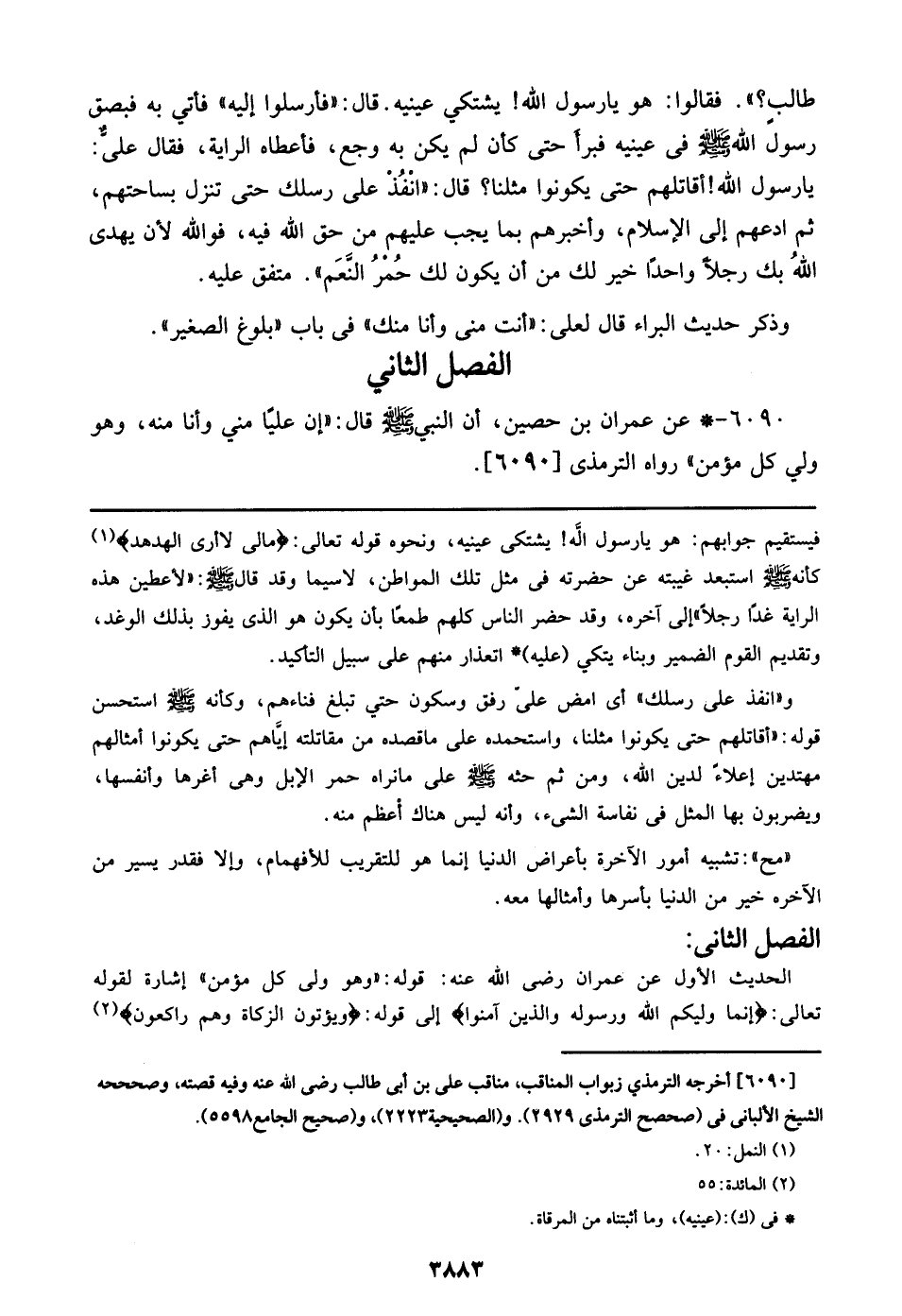 6090 - عن عمران بن حصين، أن النبي صلى الله عليه وسلم قال: ((إن علياً مني وأنا منه، وهو ولي كل مؤمن)) رواه الترمذي [6090].