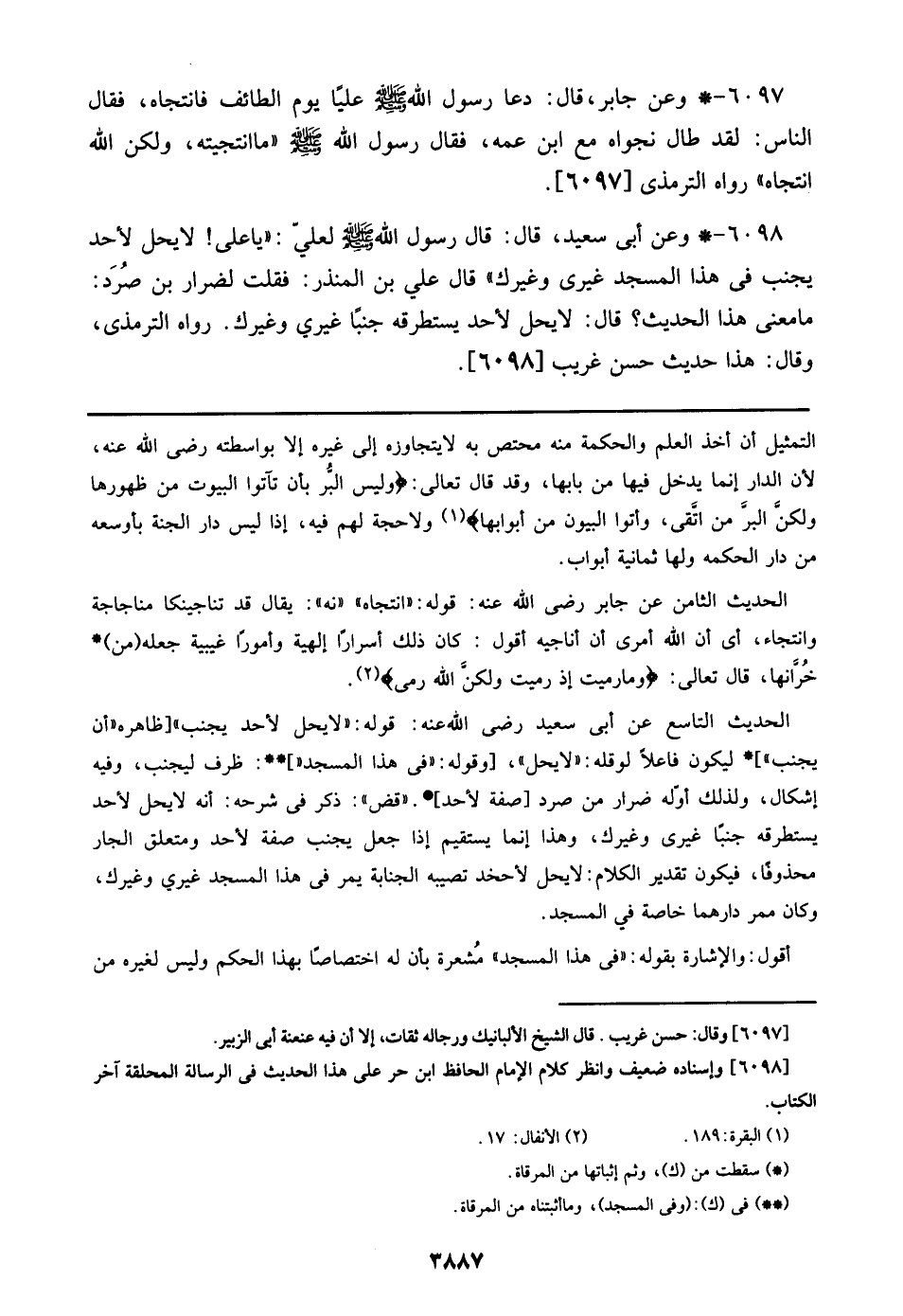 6098 - وعن أبي سعيد، قال: قال رسول الله صلى الله عليه وسلم لعلي: ((يا علي! لا يحل لأحد يجنب في هذا المسجد غيري وغيرك)) قال علي بن المنذر: فقلت لضرار بن صرد: ما معنى هذا الحديث؟ قال: لا يحل لأحد يستطرقه جنباً غيري وغيرك. رواه الترمذي، وقال: هذا حديث حسن غريب [6098].