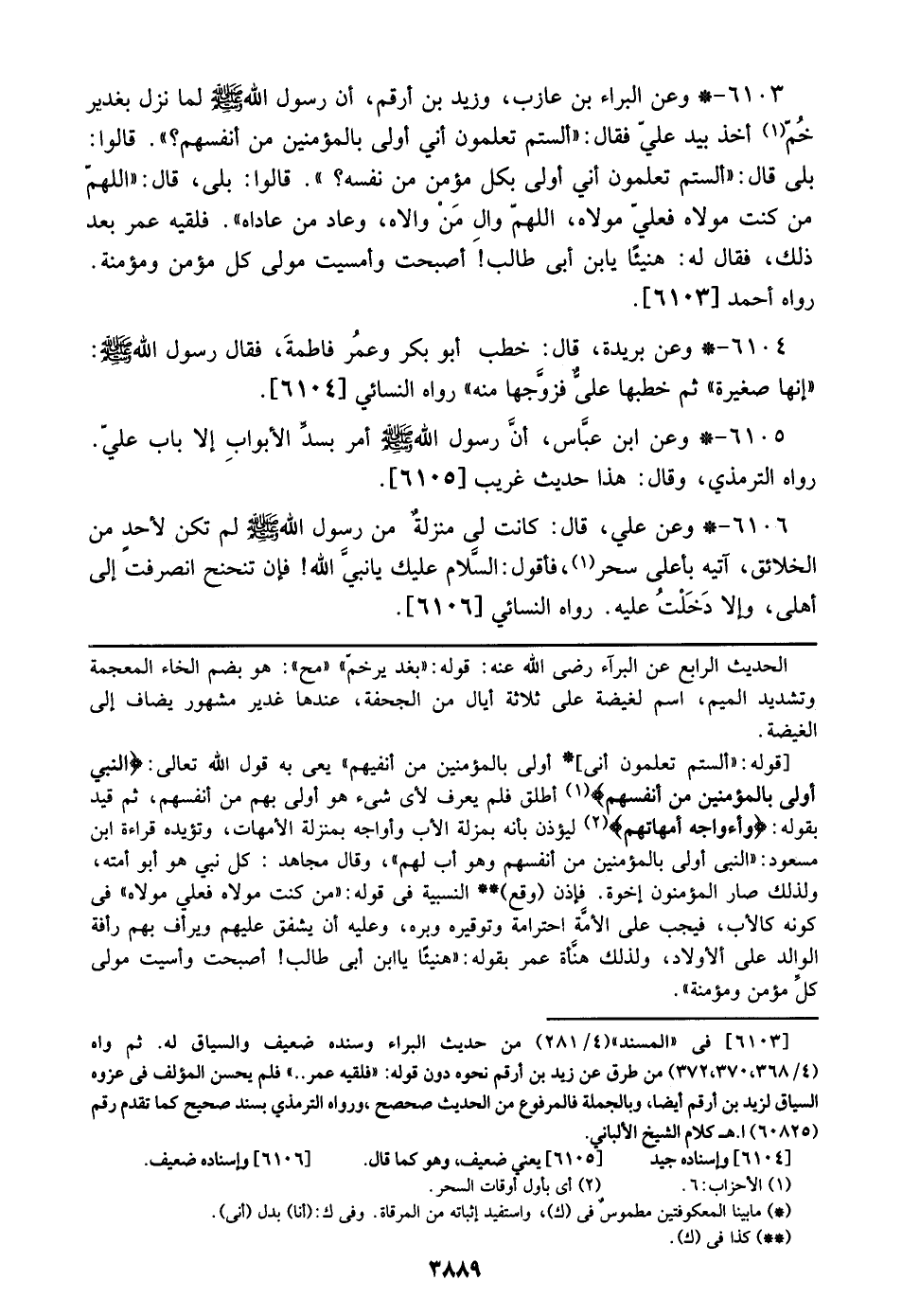 6103 - وعن البراء بن عازب، وزيد بن أرقم، أن رسول الله صلى الله عليه وسلم لما نزل بغدير خم أخذ بيد علي فقال: ((ألستم تعلمون أني أولى بالمؤمنين من أنفسهم؟)). قالوا: بلى قال: ((ألستم تعلمون أني أولى بكل مؤمن من نفسه؟)). قالوا بلى، قال: ((اللهم من كنت مولاه فعلي مولاه، اللهم وال من والاه، وعاد من عاداه)). فلقيه عمر بعد ذلك، فقال له: هنيئاً يا بن أبي طالب! أصبحت وأمسيت مولى كل مؤمن ومؤمنة. رواه أحمد [6103].