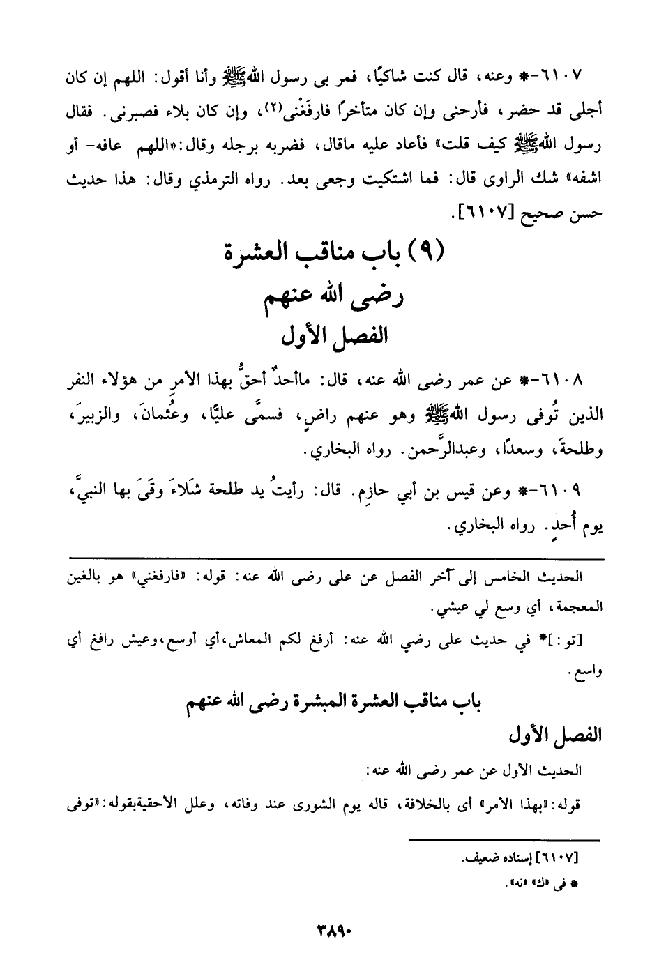 6108 - عن عمر رضي الله عنه، قال: ما أحد أحق بهذا الأمر من هؤلاء النفر الذين توفي رسول الله صلى الله عليه وسلم وهو عنهم راض، فسمي علياً، وعثمان، والزبير، وطلحة، وسعداً، وعبد الرحمن. رواه البخاري.