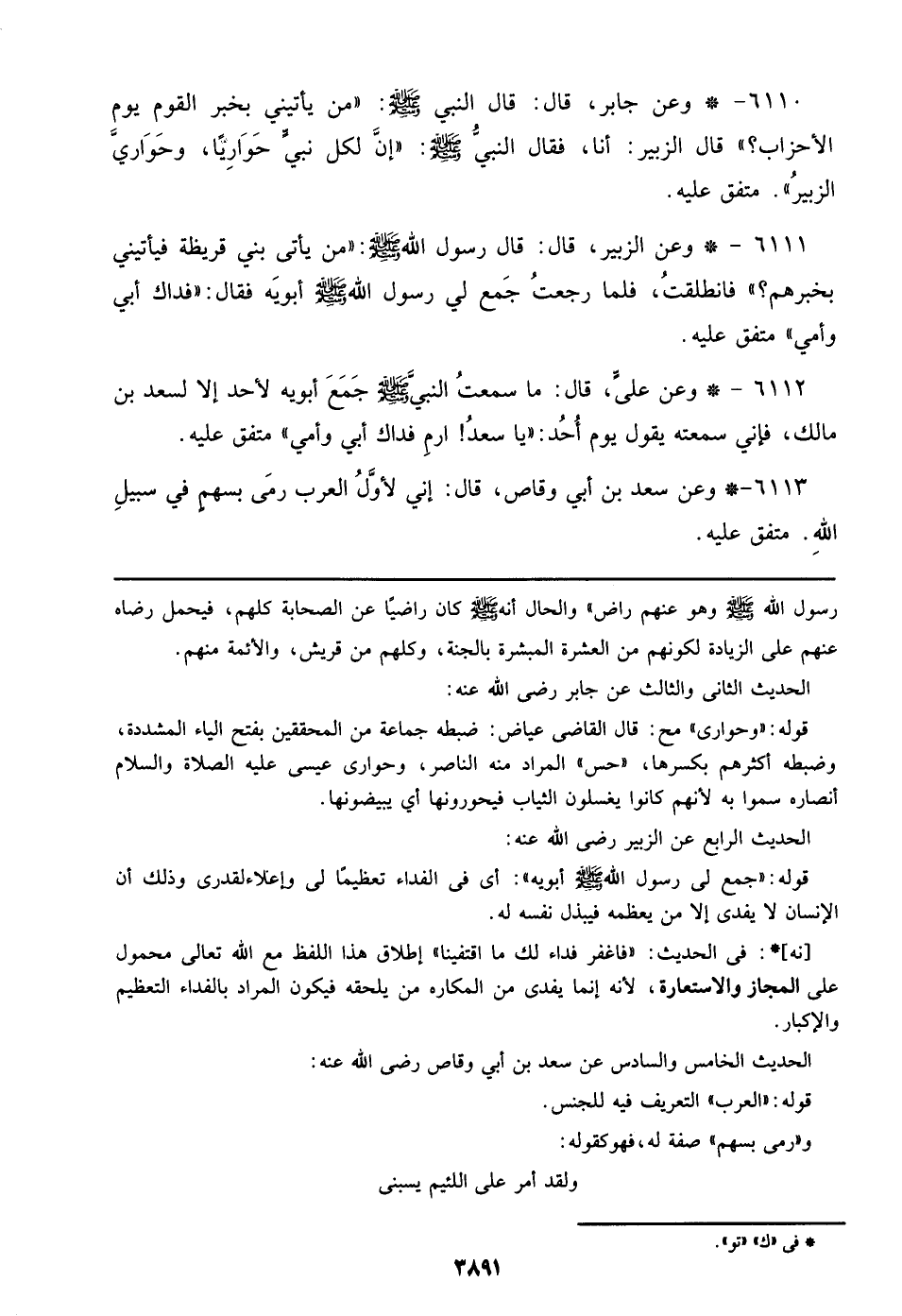 6111 - وعن الزبير، قال: قال رسول الله صلى الله عليه وسلم: ((من يأتي بني قريظة فيأتيني بخبرهم؟)) فانطلقت، فلما رجعت جمع لي رسول الله صلى الله عليه وسلم أبويه فقال: ((فداك أبي وأمي)) متفق عليه.
