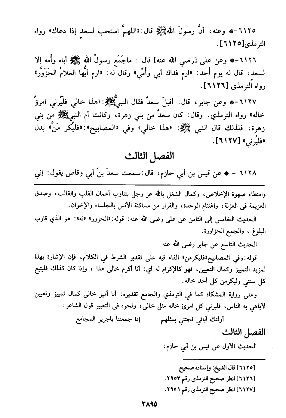 6127 - وعن جابر، قال: أقبل سعد فقال النبي صلى الله عليه وسلم: ((هذا خالي فليرني امرؤ خاله)) رواه الترمذي. وقال: كان سعد من بني زهرة، وكانت أم النبي صلى الله عليه وسلم من بني زهرة، فلذلك قال النبي صلى الله عليه وسلم: ((هذا خالي)) وفي المصابيح)): ((فليكر من)) بدل ((فليرني)) [6127].