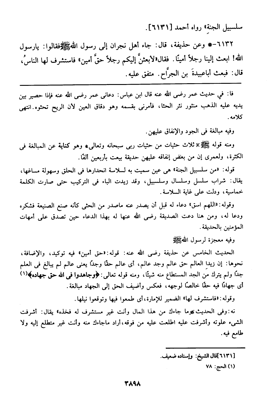 6132 - وعن حذيفة، قال: جاء أهل نجران إلى رسول الله صلى الله عليه وسلم فقالوا: يا رسول الله! ابعث إلينا رجلاً أميناً. فقال ((لأبعثن إليكم رجلاً حق أمين)) فاستشرف لها لناس، قال: فبعث أبا عبيدة بن الجراح. متفق عليه.