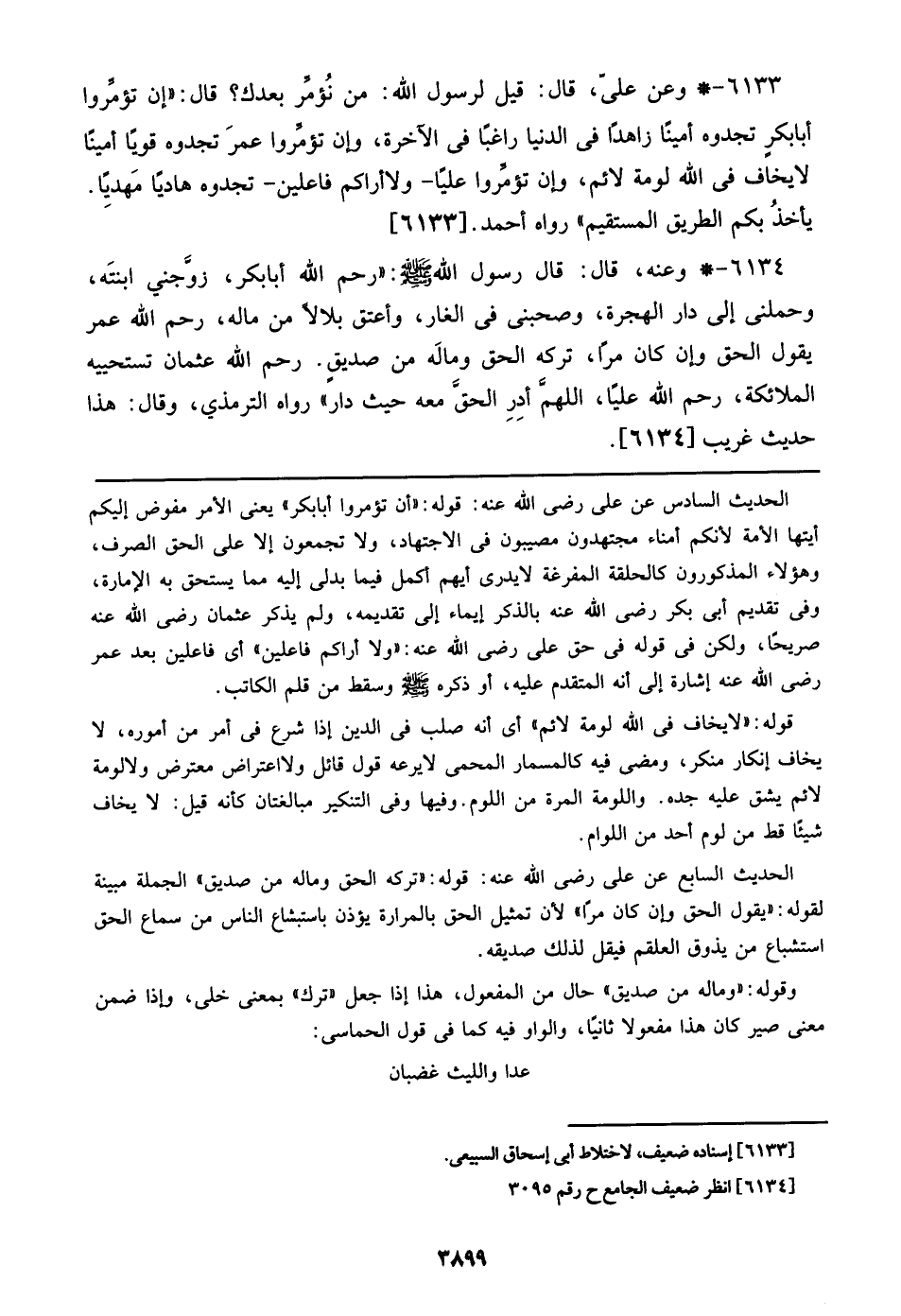 6133 - وعن علي، قال: قيل لرسول الله: من نؤمر بعدك؟ قال: ((إن تؤمروا أبا بكر تجدوه أميناً زاهداً في الدنيا راغباً في الآخرة، وإن تؤمروا عمر تجدوه قوياً أميناً لا يخاف في الله لومة لائم، وإن تؤمروا علياً- ولاأراكم فاعلين- تجدوه هادياً مهدياً. يأخذ بكم الطريق المستقيم)) رواه أحمد. [6133].