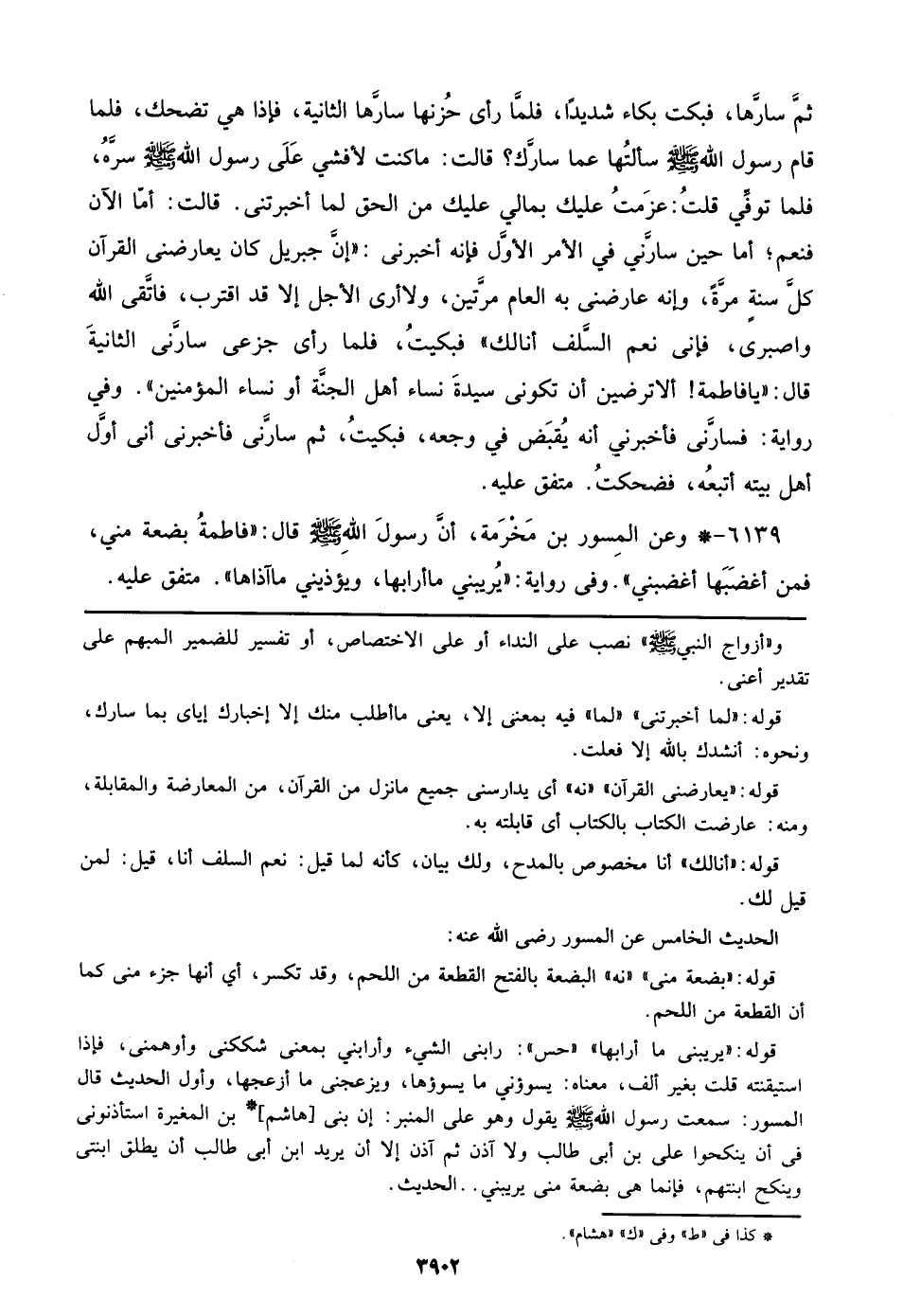 6139 - وعن المسور بن مخرمة، أن رسول الله صلى الله عليه وسلم قال: ((فاطمة بضعة مني، فمن أغضبها أغضبني)). وفي رواية: ((يريني ما أرابها، ويؤذيني ما آذاها)). متفق عليه.