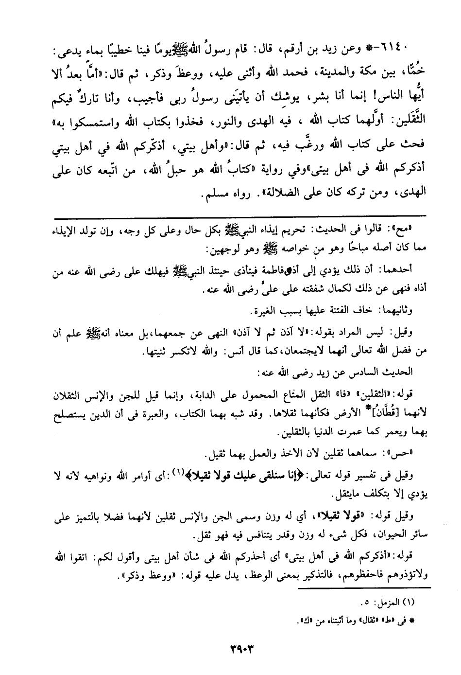 6140 - وعن زيد بن أرقم، قال: قام رسول الله صلى الله عليه وسلم يوماً فينا خطيباً بماء يدعى: خماً، بين مكة والمدينة، فحمد الله وأنثى عليه، ووعظ وذكر، ثم قال: ((أما بعد ألا أيها الناس! إنما أنا بشر، يوشك أن يأتيني رسول ربي فأجيب، وأنا تارك فيكم الثقلين: أولهما كتاب الله، وفيه الهدى والنور، فخذوا بكتاب الله واستمسكوا به)) فحث على كتاب الله ورغب فيه، ثم قال: ((وأهل بيتي، أذكركم الله في أهل بيتي أذكركم الله في أهل بيتي)) وفي رواية ((كتاب الله هو حبل الله، من اتبعه كان على الهدى، ومن تركه كان على الضلالة)). رواه مسلم.