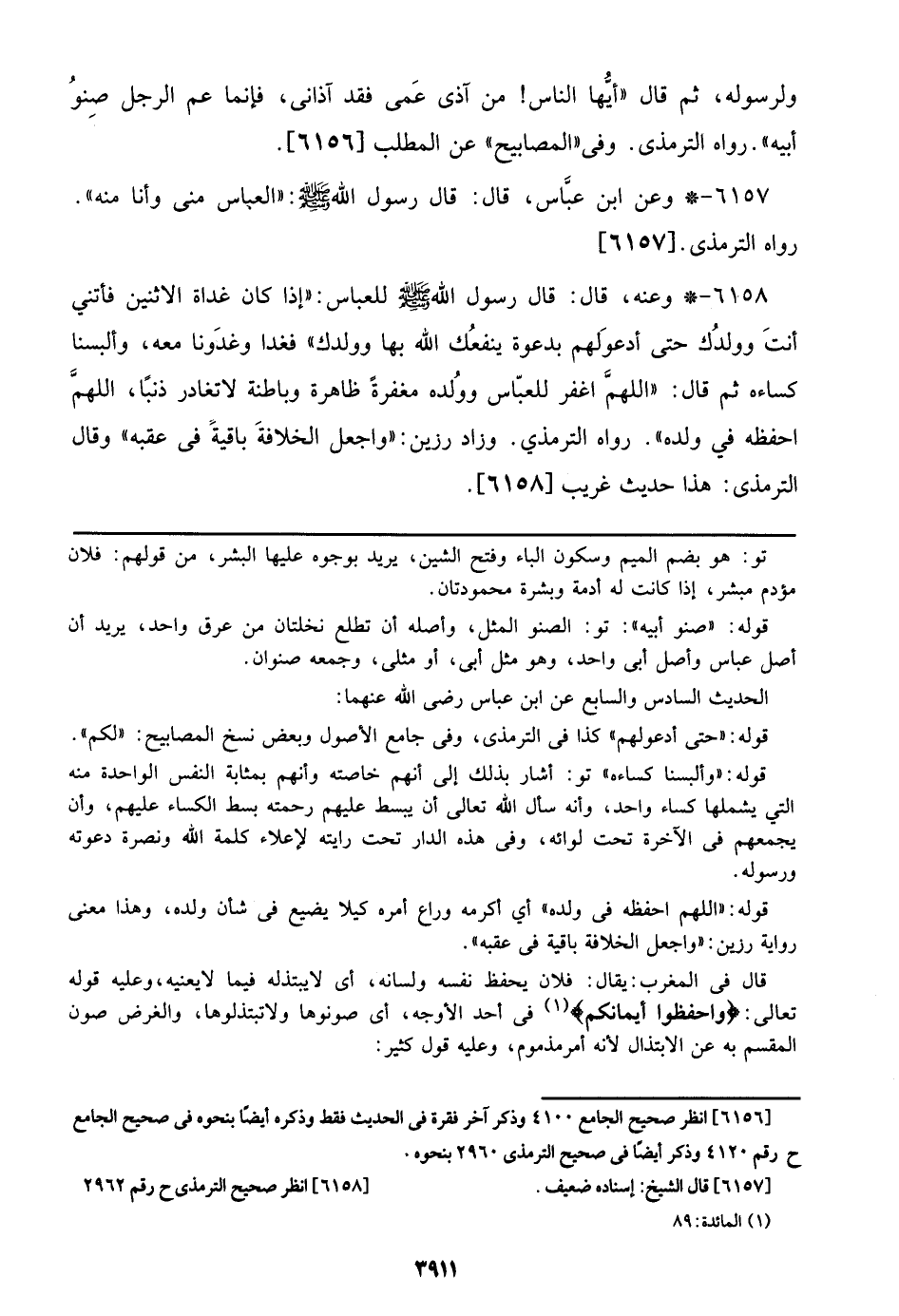 ولرسوله، ثم قال ((أيها الناس! من آذى عمي فقد آذاني، فإنما عم الرجل صنو أبيه)). رواه الترمذي. وفي ((المصابيح)) عن المطلب [6156].