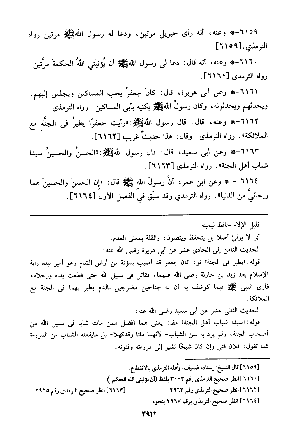6161 - وعن أبي هريرة، قال: كان جعفر يحب المساكين ويجلس إليهم، ويحدثهم ويحدثونه، وكان رسول الله صلى الله عليه وسلم يكنيه بأبي المساكين. رواه الترمذي.