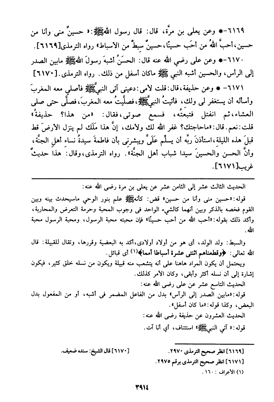 6169 - وعن يعلي بن مرة، قال: قال رسول الله صلى الله عليه وسلم: ((حسين مني وأنا من حسين، أحب الله من أحب حسينا، حسين سبط من الأسباط)) رواه الترمذي [6169].