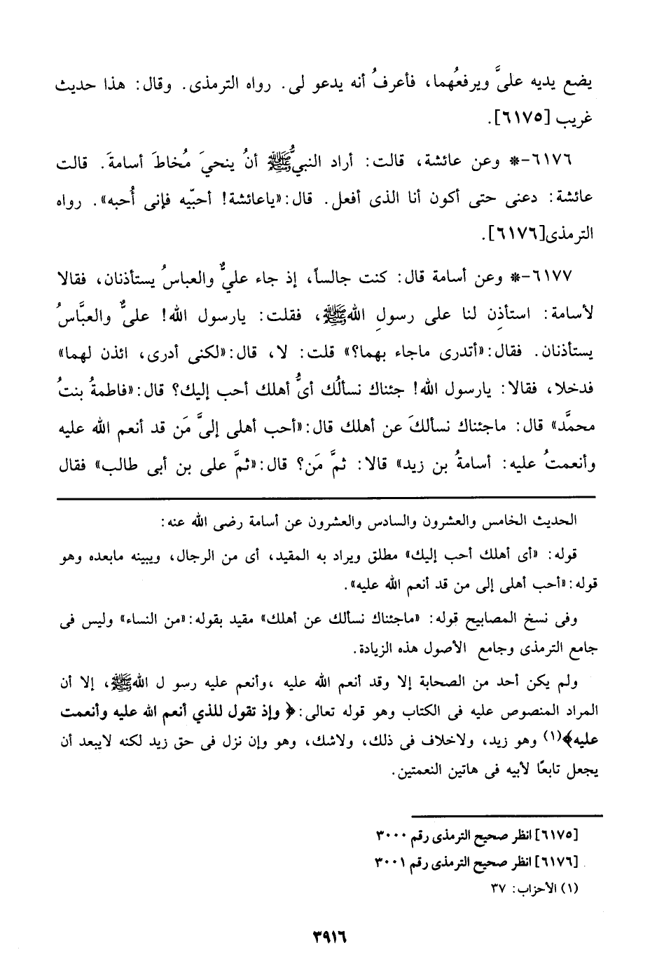 6176 - وعن عائشة، قالت: أراد النبي صلى الله عليه وسلم أن ينحي مخاط أسامة. قالت عائشة: دعني حتى أكون أنا الذي أفعل. قال: ((يا عائشة! أحبيه فإني أحبه)). رواه الترمذي [6176].