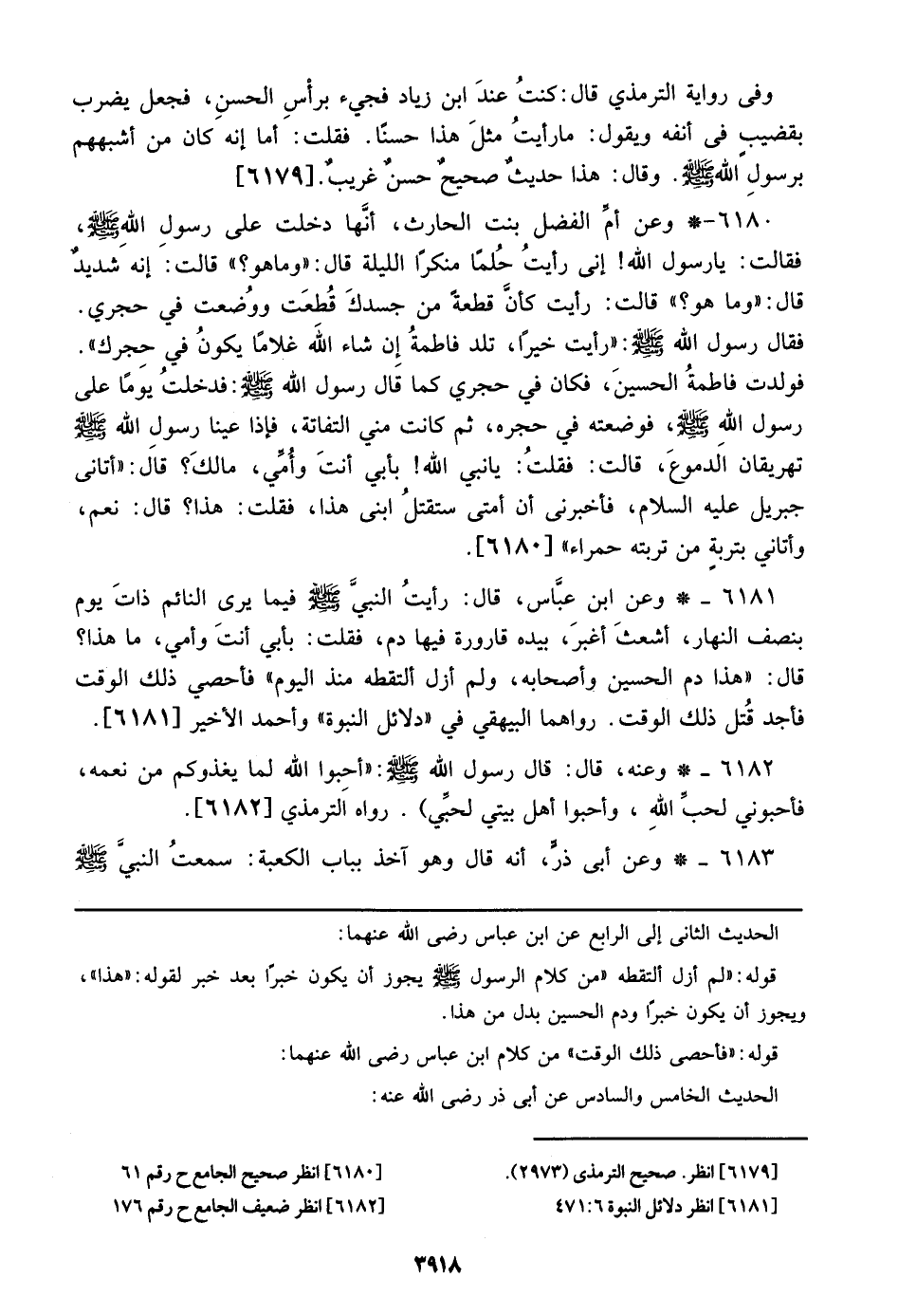 6180 - وعن أم الفضل بنت الحارث، أنها دخلت على رسول الله صلى الله عليه وسلم، فقالت: يا رسول الله! إني رأيت حلماً منكراً الليلة قال: ((وما هو؟)) قالت: إنه شديد قال: ((وما هو؟)) قالت: رأيت كأن قطعة من جسدك قطعت ووضعت في حجري. فقال رسول الله صلى الله عليه وسلم: ((رأيت خيراً، تلد فاطمة إن شاء الله غلاماً يكون في حجرك)). فولدت فاطمة الحسين، فكان في حجري كما قال رسول الله صلى الله عليه وسلم: فدخلت يوماً على رسول الله صلى الله عليه وسلم، فوضعه في حجره، ثم كانت مني التفاتة، فإذا عينا رسول الله صلى الله عليه وسلم تهريقان الدموع، قالت: فقلت: يا نبي الله! بأبي أنت وأمي، مالك؟ قال: ((أتاني جبريل عليه السلام، فأخبرني أن أمتي ستقتل ابني هذا، فقلت: هذا؟ قال: نعم، وأتاني بتربة من ترتبه الحمراء)) [6180].