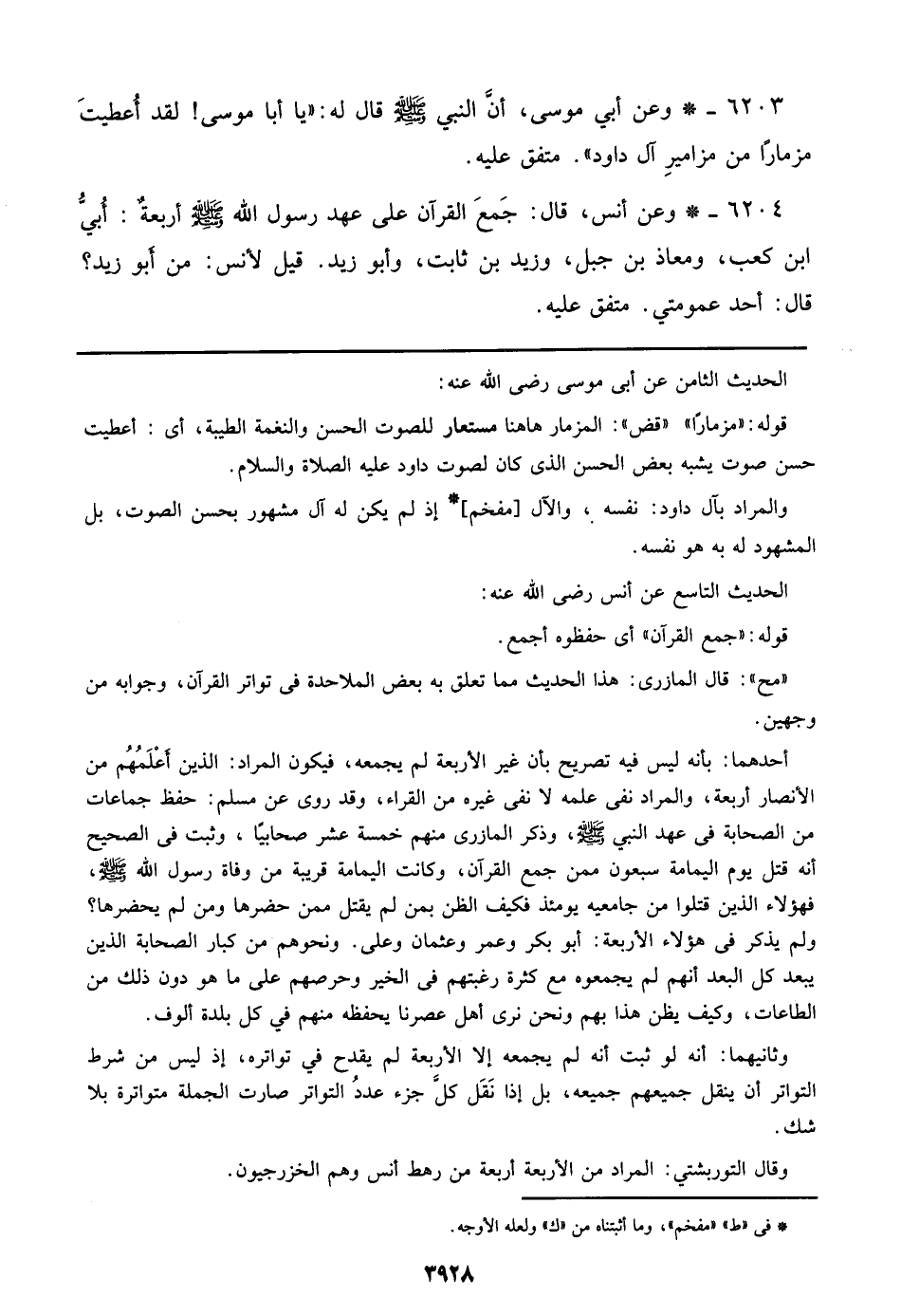 6203 - وعن أبي موسى، أن النبي صلى الله عليه وسلم قال له: ((يا أبا موسى! لقد أعطيت مزماراً من مزامير آل داود)). متفق عليه.