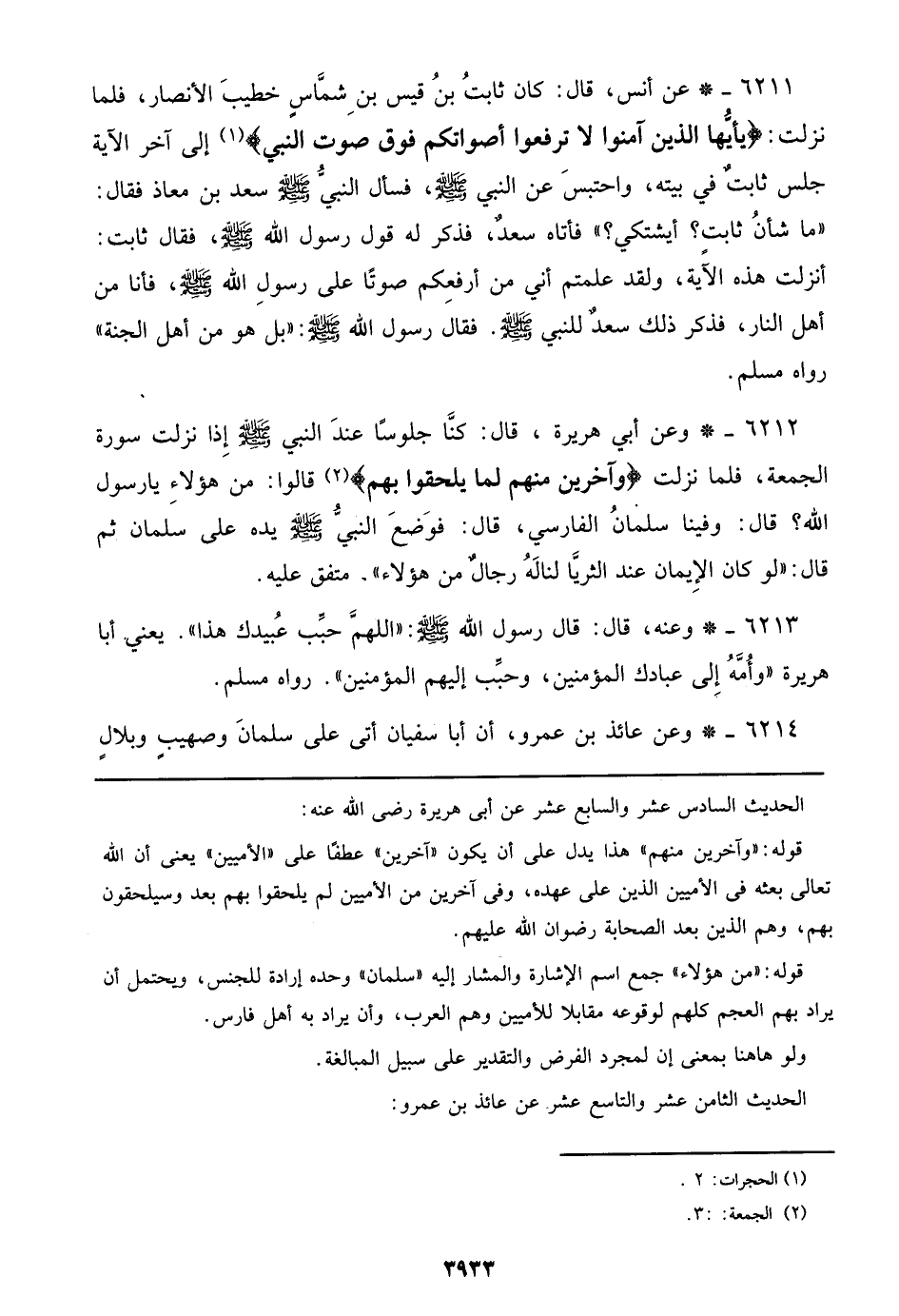 6212 - وعن أبي هريرة، قال: كنا جلوساً عند النبي صلى الله عليه وسلم إذا نزلت سورة الجمعة، فلما نزلت {وآخرين منهم لما يلحقوا بهم} قالوا: من هؤلاء يا رسول الله؟ قال: وفينا سلمان الفارسي، قال: فوضع النبي صلى الله عليه وسلم يده على سلمان ثم قال: ((لو كان الإيمان عند الثريا لناله رجال من هؤلاء)). متفق عليه.