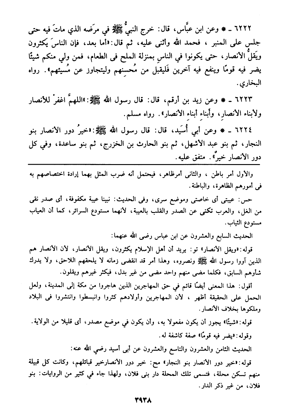 6222 - وعن ابن عباس، قال: خرج النبي صلى الله عليه وسلم في مرضه الذي مات فيه حتى جلس على المنبر، فحمد الله وأثنى عليه، ثم قال: ((أما بعد، فإن الناس يكثرون ويقل الأنصار، حتى يكونوا في الناس بمنزلة الملح في الطعام، فمن ولي منكم شيئاً يضر فيه قوماً وينفع فيه آخرين فليقبل من محسنهم وليتجاوز عن مسيئهم)). رواه البخاري.