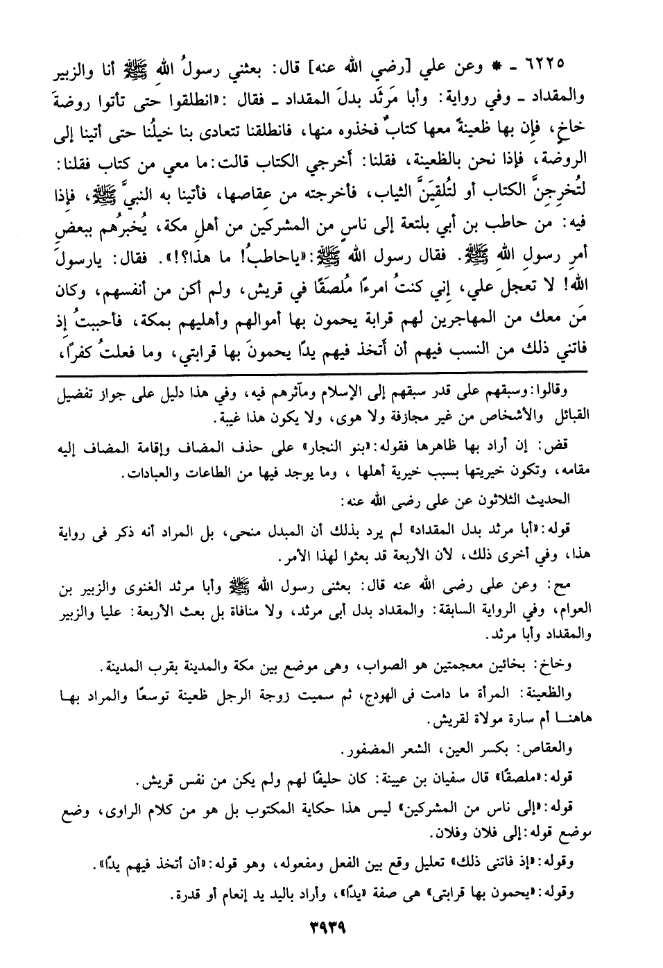 6225 - وعن علي [رضي الله عنه] قال: بعثني رسول الله صلى الله عليه وسلم أنا والزبير والمقداد- وفي رواية: وأبا مرثد بدل المقداد- فقال: ((انطلقوا حتى تأتوا روضة خاخ، فإن بها ظعينة معها كتاب فخذوه منها، فانطلقنا تتعادى بنا خيلنا حتى أتينا إلى الروضة، فإذا نحن بالظعينة، فقلنا: أخرجي الكتاب قالت: ما معي من كتاب فقلنا: لتخرجن الكتاب أو لتلقين الثياب، فأخرجته من عقاصها، فأتينا به النبي صلى الله عليه وسلم، فإذا فيه: من حاطب بن أبي بلتعة إلى ناس من المشركين من أهل مكة، يخبرهم ببعض أمر رسول الله صلى الله عليه وسلم. فقال رسول الله صلى الله عليه وسلم: ((يا حاطب! ما هذا؟!)). فقال: يا رسول الله! لا تعجل علي، إني كنت امرءاً ملصقاً في قريش، ولم أكن من أنفسهم، وكان من معك من المهاجرين لهم قرابة يحمون بها أموالهم وأهليهم بمكة، فأحببت إذ فاتني ذلك من النسب فيهم أن أتخذ فيهم يداً يحمون بها قرابتي، وما فعلت كفراً،