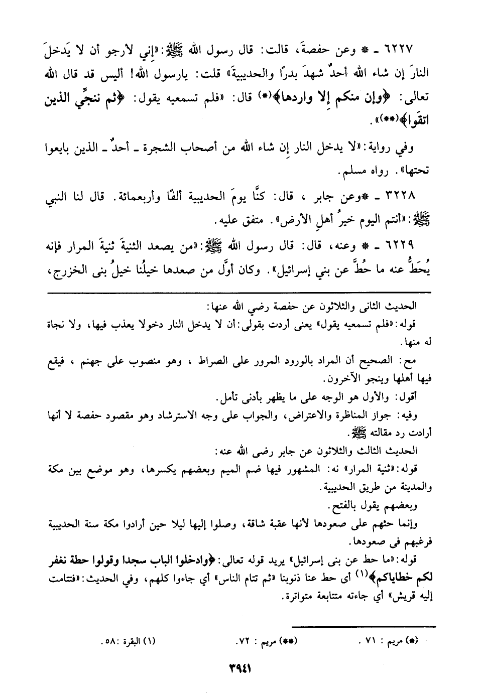 6227 - وعن حفصة، قالت: قال رسول الله صلى الله عليه وسلم: ((إني لأرجو أن لا يدخل النار إن شاء الله أحد شهد بدراً والحديبية)) قلت: يا رسول الله! أليس قد قال الله تعالى: {وإن منكم إلا واردها} قال: ((فلم تسمعيه يقول: {ثم ننجي الذين اتقوا})).