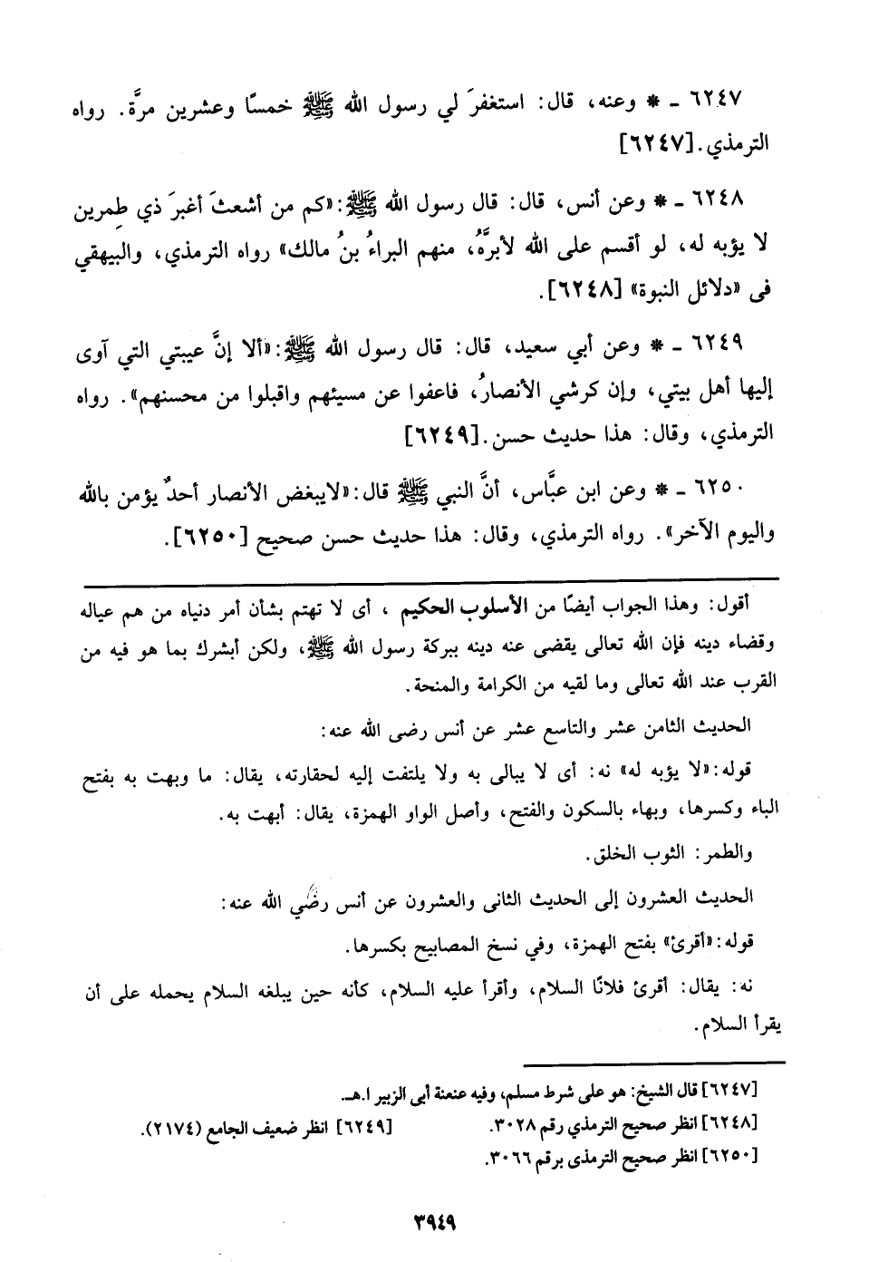 6250 - وعن ابن عباس، أن النبي صلى الله عليه وسلم قال: ((لا يبغض الأنصار أحد يؤمن بالله واليوم الآخر)). رواه الترمذي، وقال: هذا حديث حسن صحيح [6250].