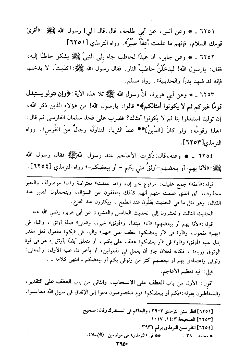 6254 - وعنه، قال: ذكرت الأعاجم عند رسول الله صلى الله عليه وسلم فقال رسول الله صلى الله عليه وسلم: ((لأنا بهم- أو ببعضهم- أوثق مني بكم- أو ببعضكم-)) رواه الترمذي [6254].