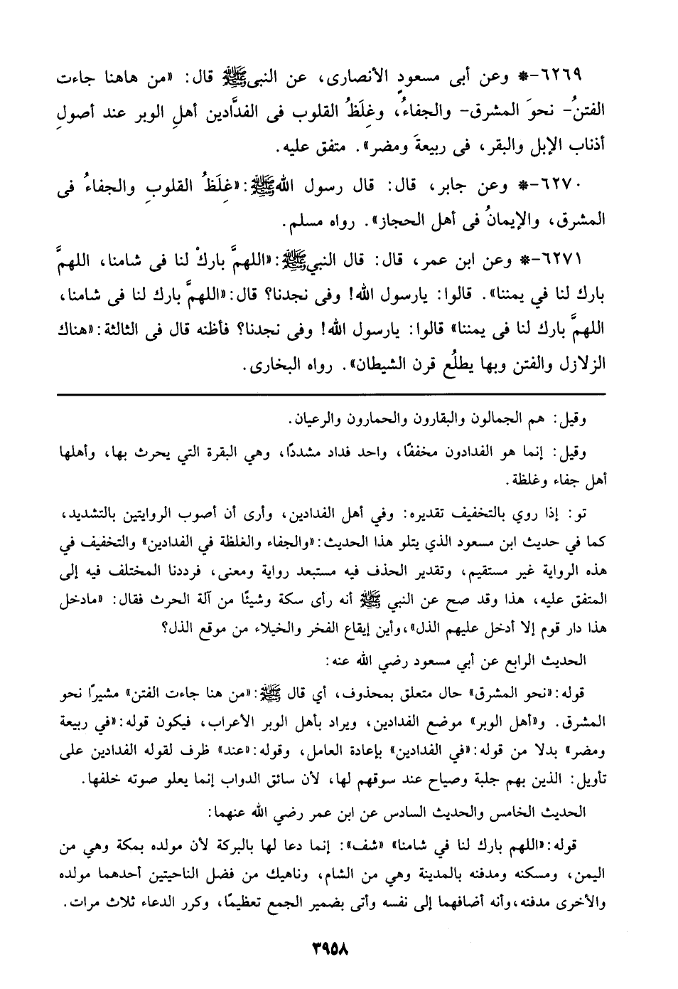 6271 - وعن ابن عمر، قال: قال النبي صلى الله عليه وسلم: ((اللهم بارك لنا في شامنا، اللهم بارك لنا في يمننا)). قالوا: يا رسول الله! وفي نجدنا؟ قال: ((اللهم بارك لنا في شامنا، اللهم بارك لنا في يمننا)) قالوا: يا رسول الله! وفي نجدنا؟ فأظنه قال في الثالثة: ((هناك الزلازل والفتن وبها يطلع قرن الشيطان)). رواه البخاري.