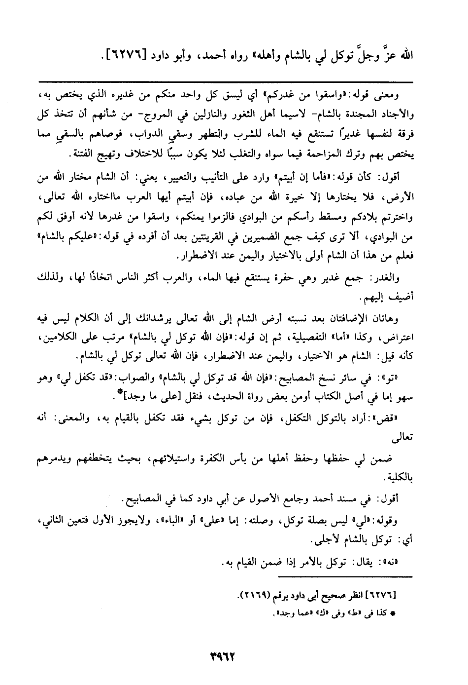 ((تو)): في سائر نسخ المصابيح: ((فإن الله قد توكل لي بالشام)) والصواب: ((قد تكفل لي)) وهو سهو إما في أصل الكتاب أو من بعض رواة الحديث، فنقل [على ما وجد].