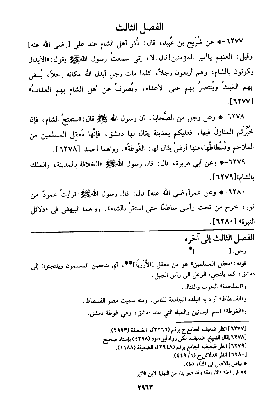 6278 - وعن رجل من الصحابة، أن رسول الله صلى الله عليه وسلم قال: ((ستفتح الشام، فإذا خيرتم المنازل فيها، فعليكم بمدينة يقال لها دمشق، فإنها معقل المسلمين من الملاحم وفسطاطها، منها أرض يقال لها: الغوطة)). رواهما أحمد [6278].